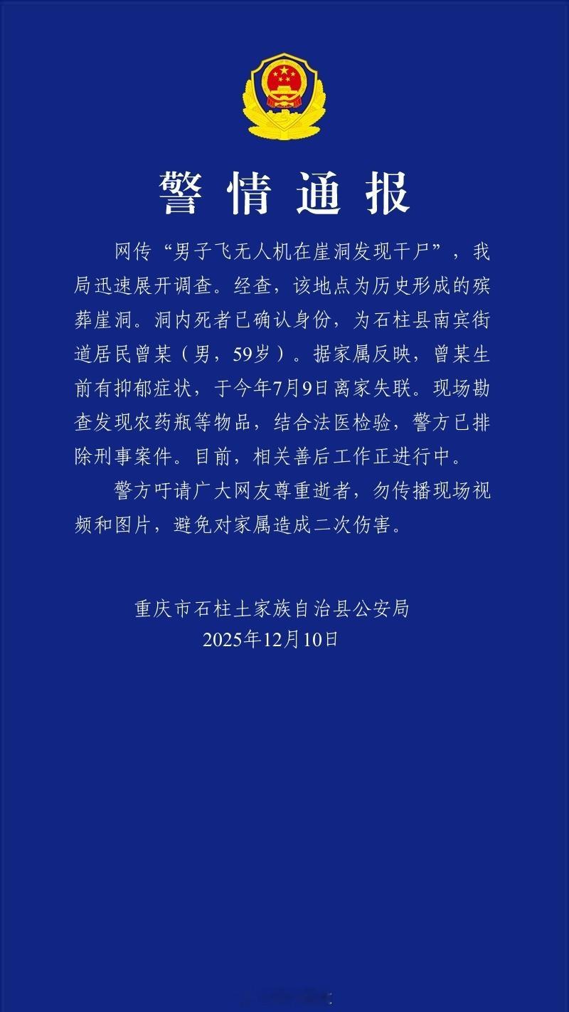 警方通报男子飞无人机崖洞发现干尸 崖洞干尸系59岁生前抑郁男子 唉....崖洞干尸系59岁生前抑郁男子 男子飞无人机时在崖洞中发现干尸