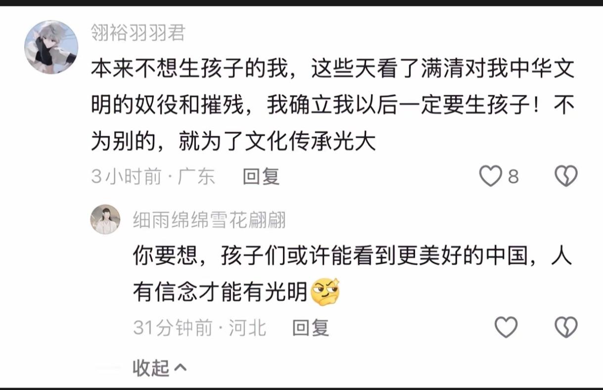 史书不看,资料不查,偶然刷到视频,然后下定决心生孩子,传承文化!今天看这个我决定了我要干什么,明天看那个我又决定了我要干什么了,现实中真的有这样的人吗?乐意生就生但别说是为了什么什么生的,就像有的家庭你生了一胎还想生二胎,还找个借口跟大宝宝说给你生个兄弟姐妹以后有人陪你。