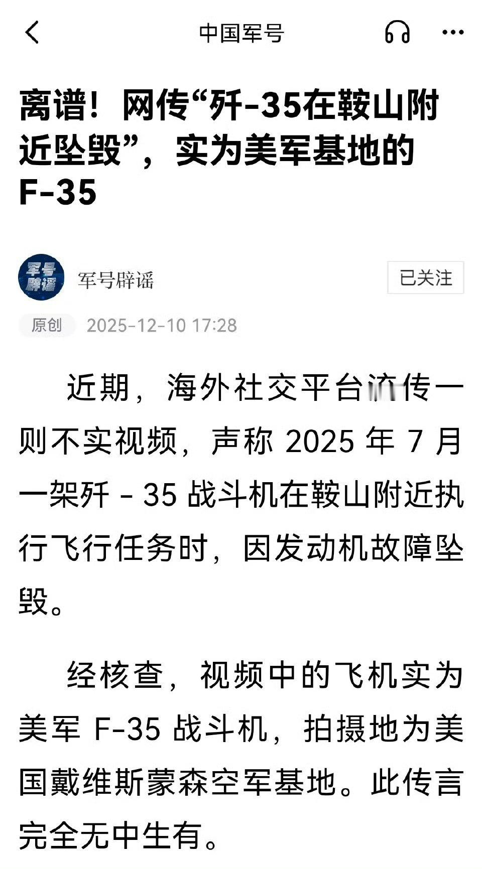 辟谣:近期,海外社交平台流传一则不实视频,声称 2025 年 7 月一架歼 - 35 战斗机在鞍山附近执行飞行任务时,因发动机故障坠毁。经核查,视频中的飞机实为美军 F-35 战斗机,拍摄地为美国戴维斯蒙森空军基地。此传言完全无中生有。 烽火问鼎计划热点观点