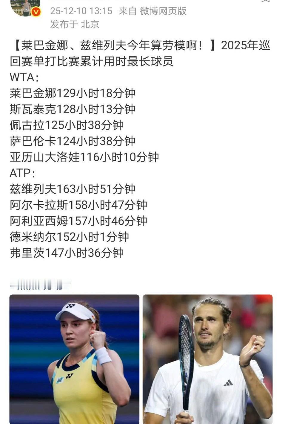 莱巴金娜、兹维列夫是2025年巡回赛单打比赛累计用时最长球员。 紫薇参加有积分+奖金的比赛24站,只比只参加了13站的德鸡,才多拿80万美元奖金。