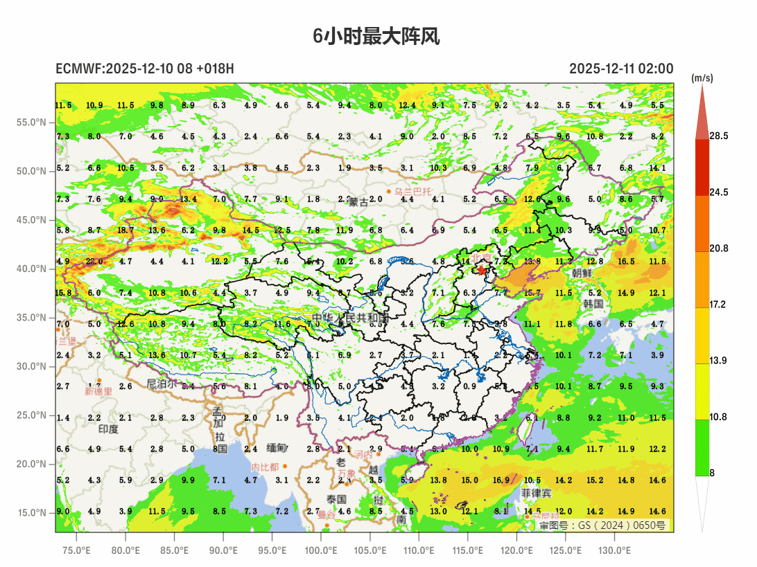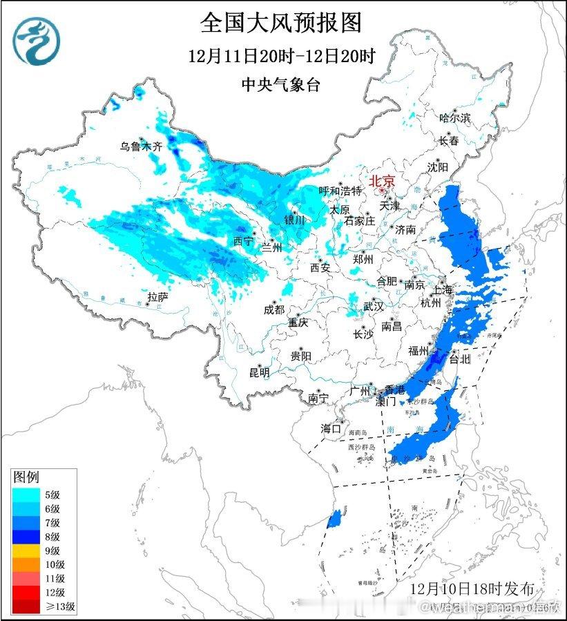 【大风】未来冷空气从东西两路南下,导致西北以及东部海区有大风天气。明天陆地上最强的风可能出现在新疆山口地区以及新疆南部和西藏、青海交界一带。后天陆地上最强的风可能出现在青海南部。今晚中央气象台继续发布大风蓝色预警:预计,12月10日20时至11日20时,新疆北部、甘肃河西、青海南部、内蒙古西部、华北西部、山东半岛、辽东半岛、西藏中北部等地部分地区有5~7级风、阵风8~9级的大风,其中,新疆山口地区阵风可达10~11级;渤海、渤海海峡、黄海大部海域、东海北部海域、台湾海峡、南海中东部海域将有7级、阵风8~9级的大风,其中渤海、黄海北部部分海域风力可达8级、阵风9~10级。12月11日20时至12日20时,新疆北疆东部和南疆山区、西北地区中东部、内蒙古西部、华北西部、山东半岛、西藏中北部等地部分地区有5~7级风、阵风8~9级的大风,其中,新疆山口地区阵风可达10~11级;黄海大部海域、东海大部海域、台湾海峡、南海东北部和中东部海域将有7级、阵风8~9级的大风,其中黄海东部海域、台湾海峡部分海域风力可达8级、阵风9级。