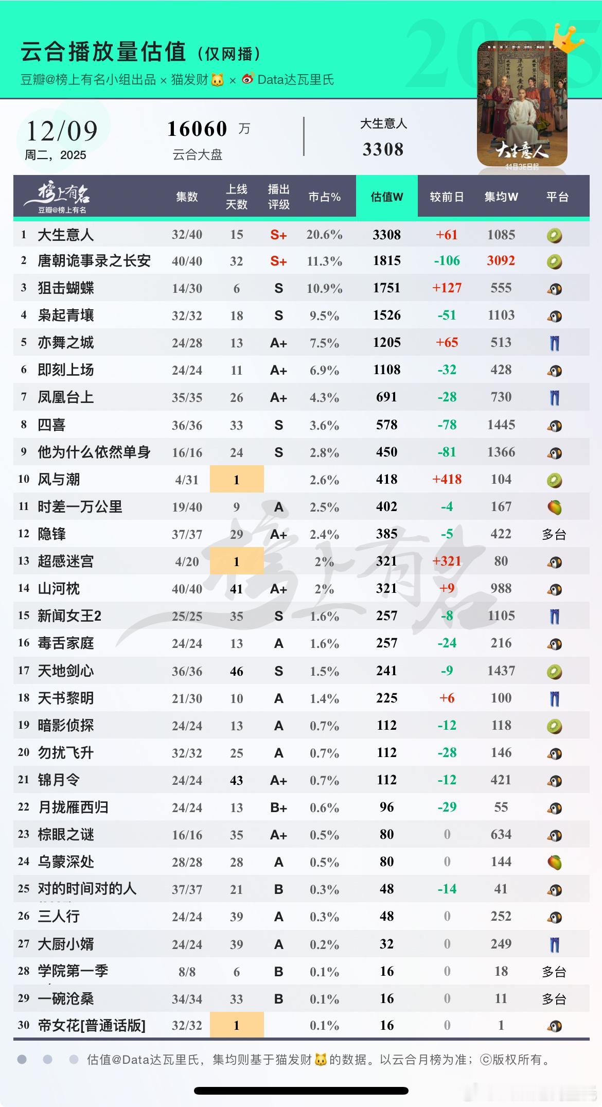12.9云合估值🌴豆瓣榜上有名小组出品1 大生意人 S+ 3308 +612 唐朝诡事录之长安 S+ 1815 -1063 狙击蝴蝶 1751 +1274 枭起青壤 集均破1100万5 亦舞之城 1205 +656 即刻上场 1108 -327 凤凰台上 691 -288 四喜 578 -789 他为什么依然单身 450 -8110 风与潮 首播 418万13 超感迷宫 首播 321 狙击蝴蝶剧组工作人员发文