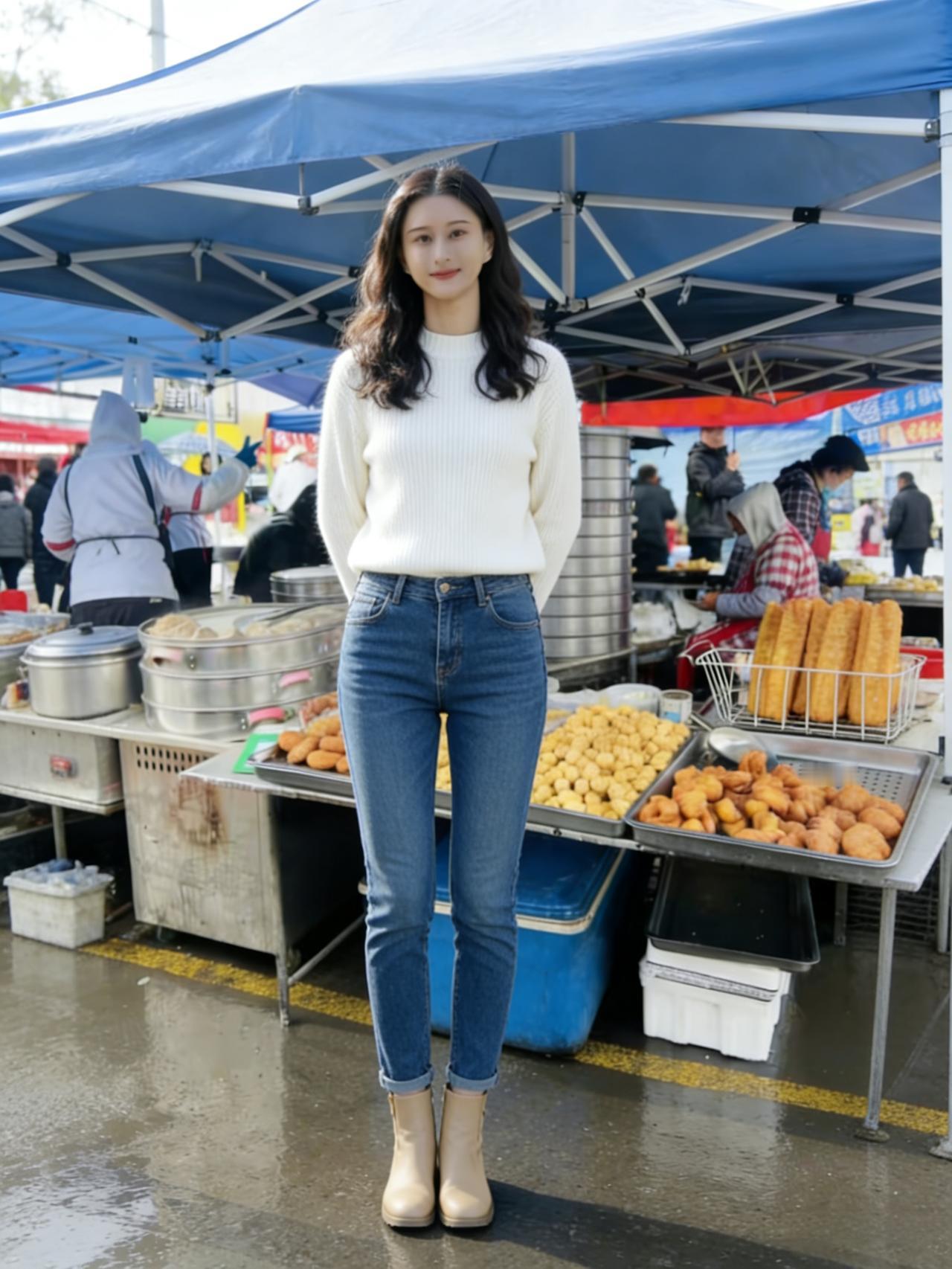 蓝篷支起市井的热闹 蒸汽裹着油条的香,漫过晨雾 白毛衣接住细碎的光 像云落进人间的烟火里 ~ 牛仔裤裹着尘世的风 脚步踩过湿漉漉的水泥地 身后是蒸笼的喧腾,油星的跳荡 她站成一抹温柔的留白 ~ 人群在食材间穿梭,讨价声起落 竹筐里的金黄,是生活的甜香 她的目光轻扫过摊位 像掠过一整个鲜活的清晨 ~ 发丝拂过肩头,带着市井的暖 喧嚣里,她是安静的坐标 把烟火气,揉进纯白的温柔里 市集的晨光,在她眼底轻轻摇晃