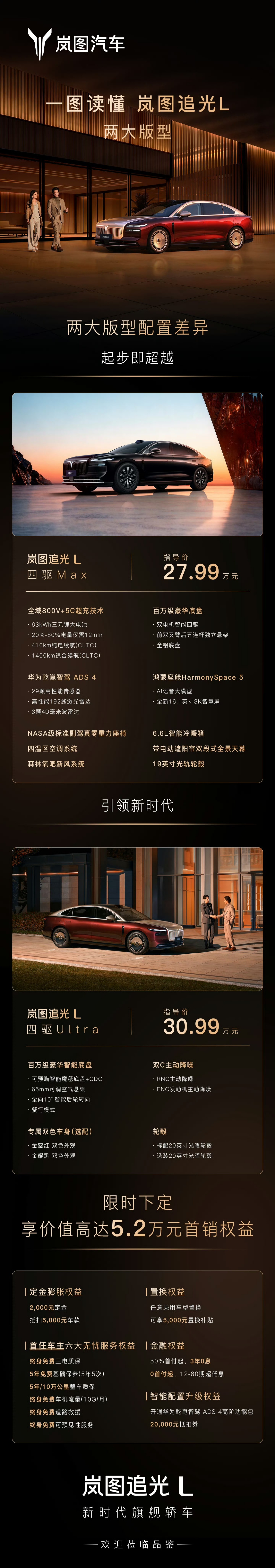27.99万起岚图追光L压轴上市 岚图追光L正式上市,27.99万起,顶配Ultra版30.99万。全域800V的超混架构,电池给到了63kWh,配备了魔毯悬挂和后轮转向,5米1几的车,转弯半径只有5.55米。智能化上更不用说,华为系经典的乾崑ADS 4+鸿蒙座舱两件套。而且定位是旗舰,豪华感和情绪价值上岚图也很到位,双拼色车身、内饰软包+实木,还给到了轮毂悬浮车标。30万级豪华轿车首选岚图追光L