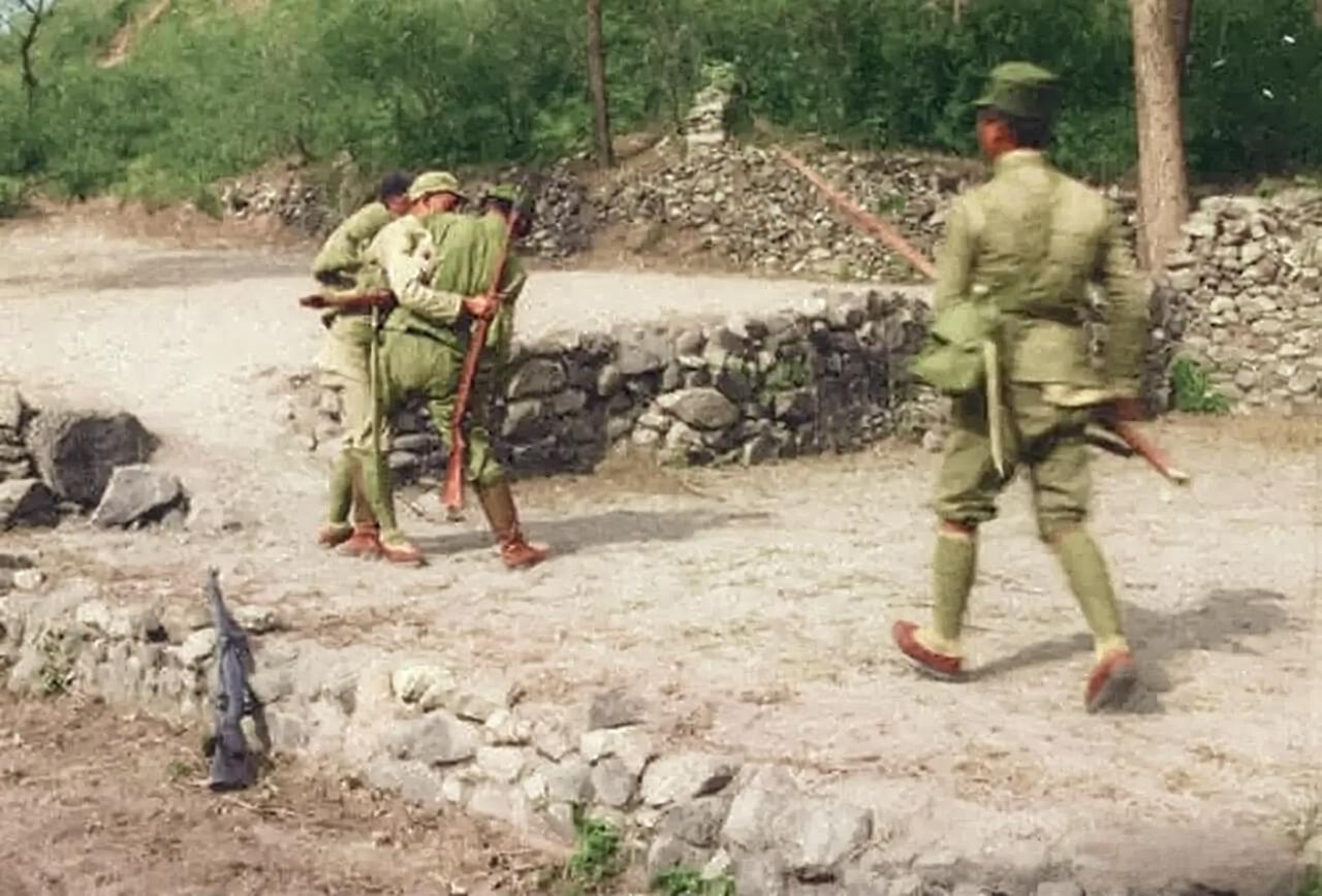 这是抗战时期中,我军与日军的真实战斗瞬间,一名八路军战士正与日寇展开近身扭打,体能已显吃力却仍死战不退;另一名战友抓住战机,挺刺刀直刺日军后背。 这一震撼场景,正是由著名战地摄影师沙飞冒着生命危险记录下的,抗战期间,沙飞多次深入前线,在枪林弹雨中用镜头留存下八路军等抗日武装与日寇厮杀的画面。