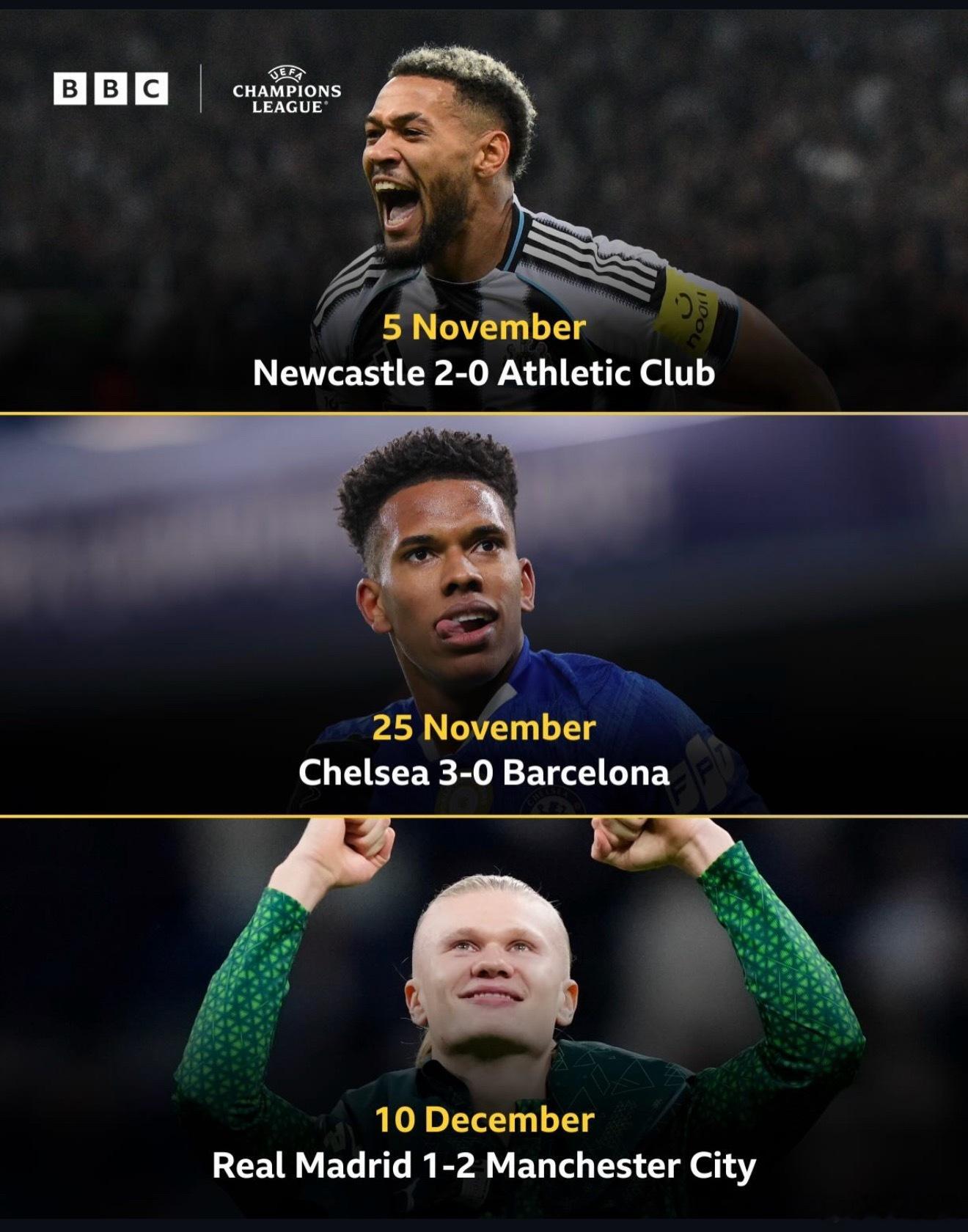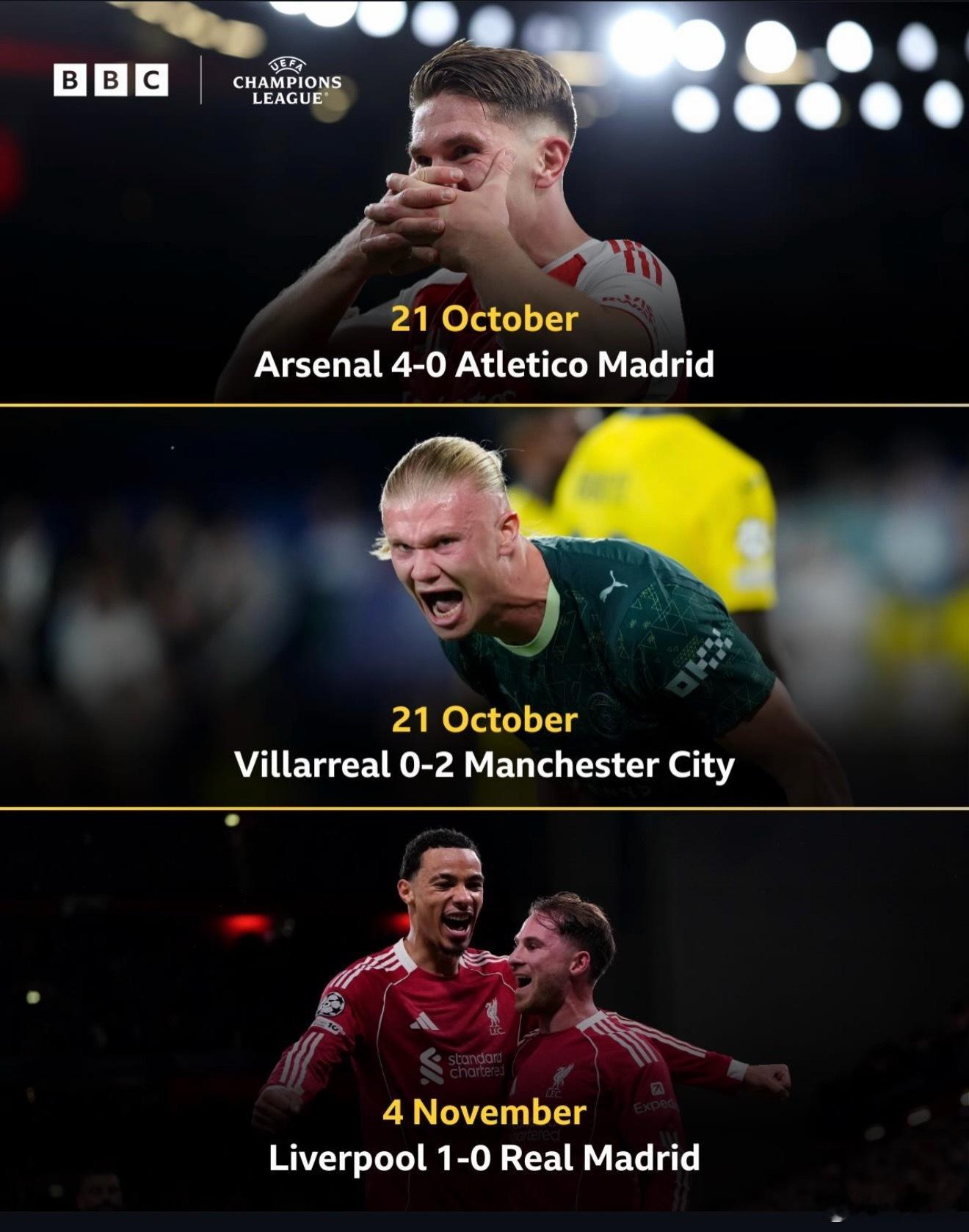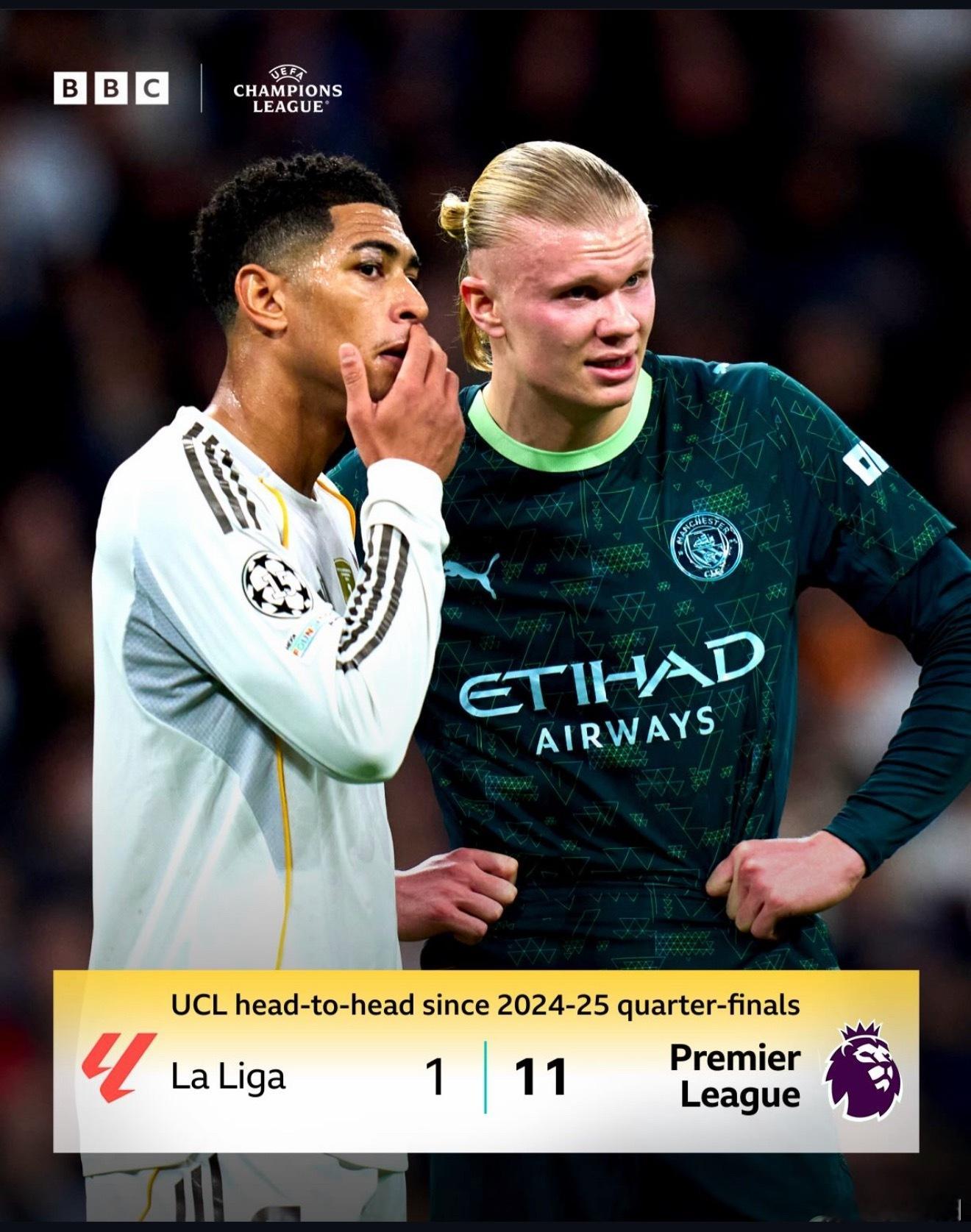 92%!这是 2025 年 4 月到今天,英超和西甲俱乐部的 12 场欧冠对话,英超球队碾压式的胜率。皇马1比2曼城 12 场对话,英超球队赢了 11 场!要不是 9 月份巴萨曾经 2 比 1 客场击败过纽卡斯尔,英超球队差一点就获得了对西甲球队的 12 连胜。皇马这一年里已经连续输给了阿森纳、利物浦和曼城。马竞对英超球队同样也是遭遇 4 连败。阿森纳虽然在英超积分榜领先优势被缩小,但在欧冠里,仍然以全胜战绩领跑积分榜。欧冠联赛布鲁日0比3阿森纳