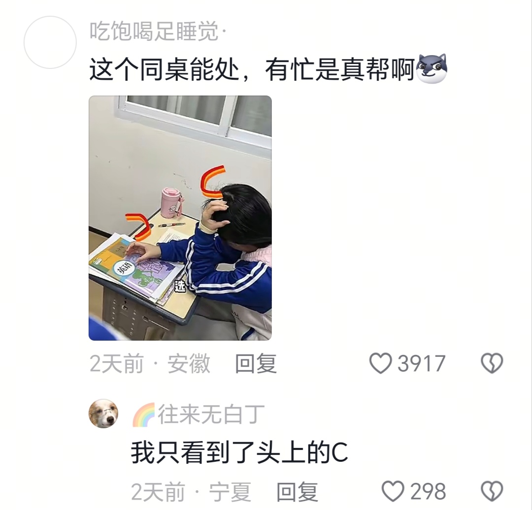 这个同桌能处,有忙是真帮啊 我只看到了头上的C