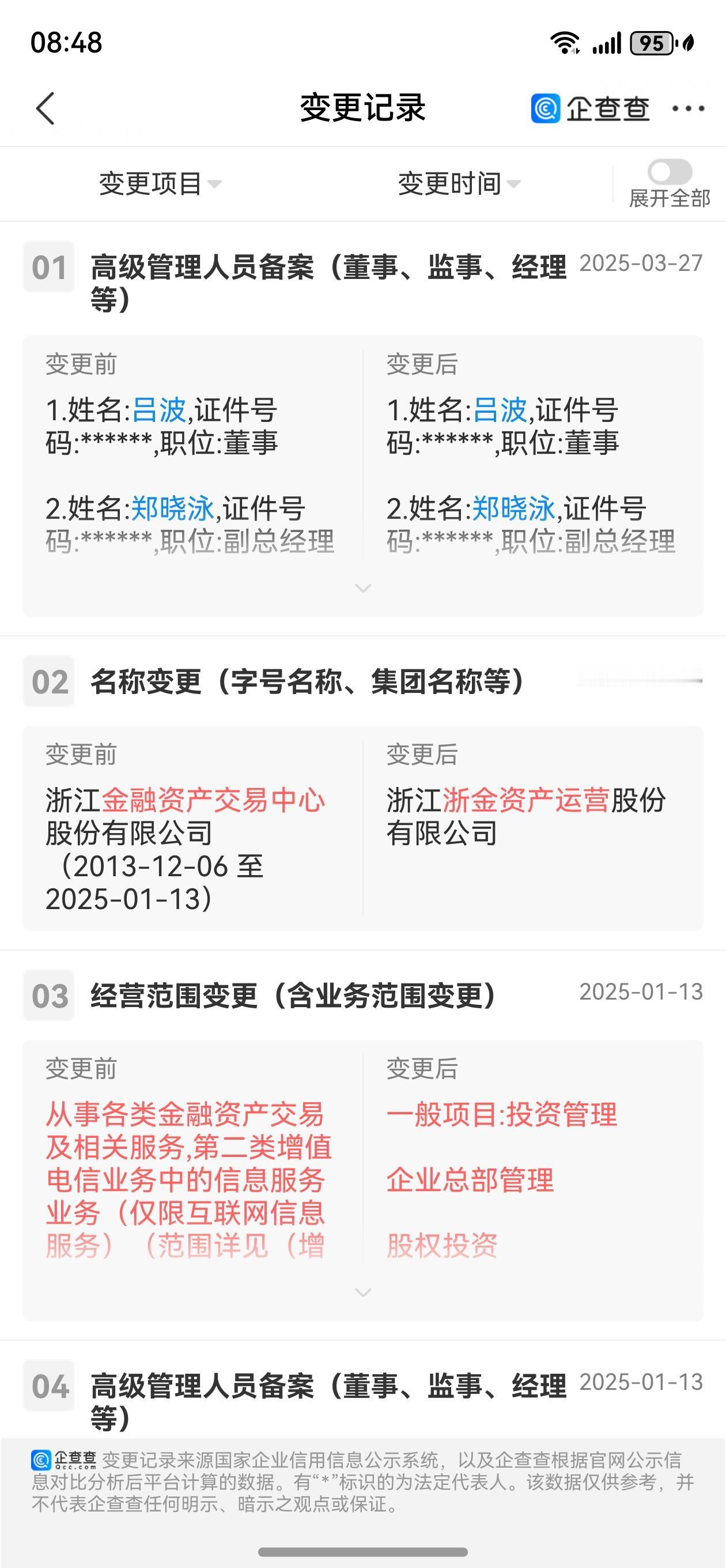 有媒体报道,浙江金融资产交易中心200亿元(人民币,下同,约37亿新元)投资产品违约后,公司官网首页已将公司名称由“浙江金融资产交易中心股份有限公司”更改为“浙江浙金资产运营股份有限公司”。 这个得辟个谣,浙江金融资产交易中心股份有限公司早在今年1月13日就已经将公司名称变更为“浙江浙金资产运营股份有限公司”而并非是在投资产品爆雷之后临时变更。 同时值得关注的是,在随后的3月27日,该公司的监事、董事和经理等高管人员进行了较大调整,有4人不再担任副总经理,一人不再担任监事。新提拔两人为副总经理,另外新进两名监事一名副总经理。