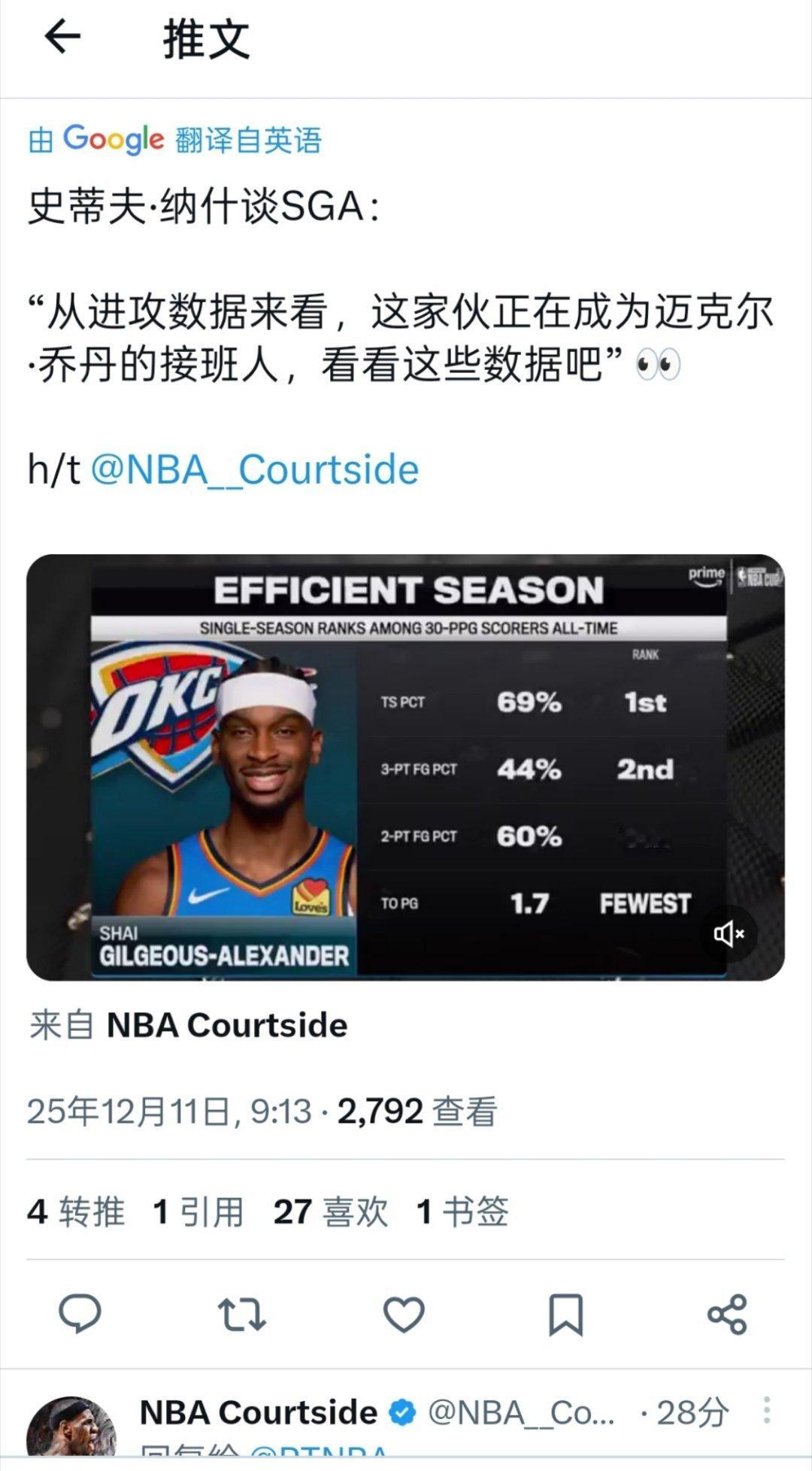 ▲纳什:从数据上看,SGA将成为乔丹的接班人