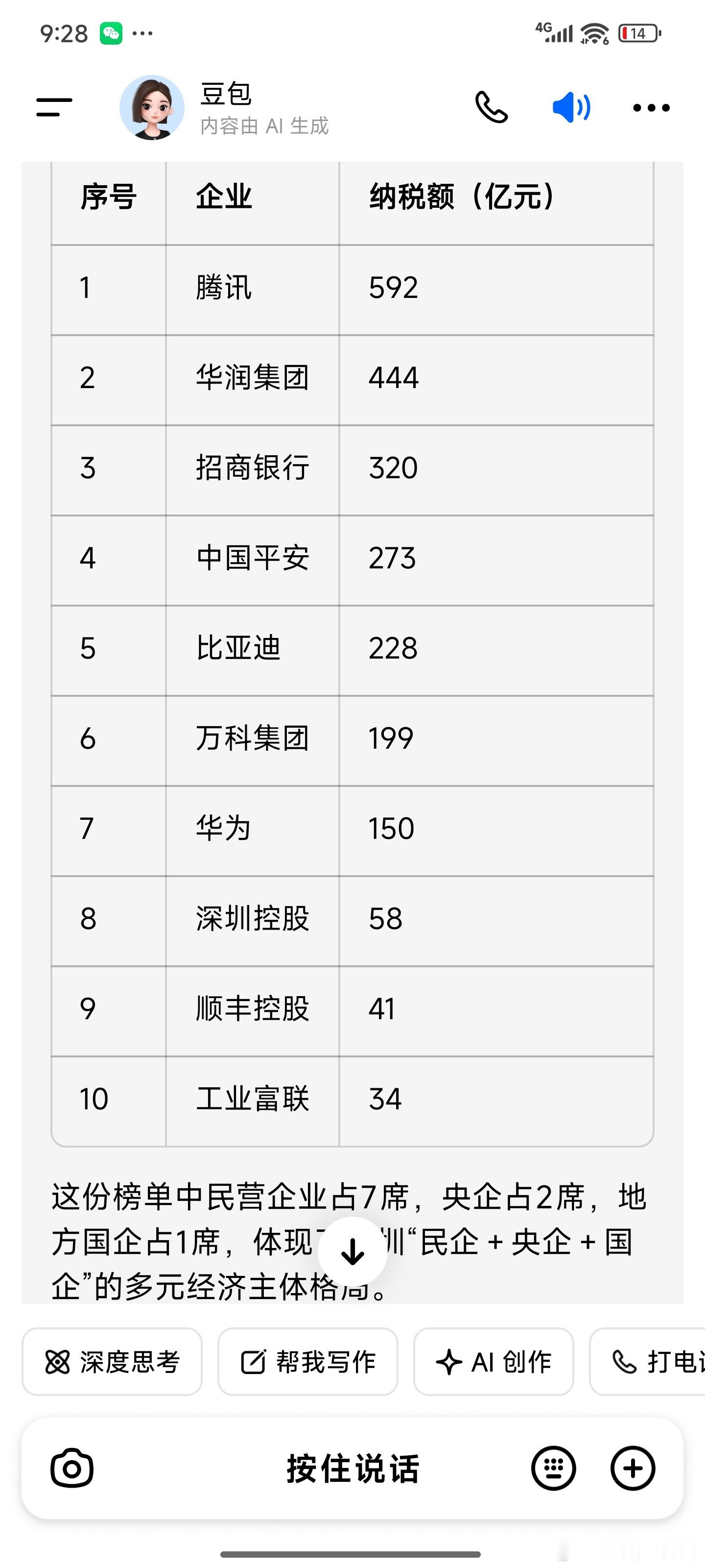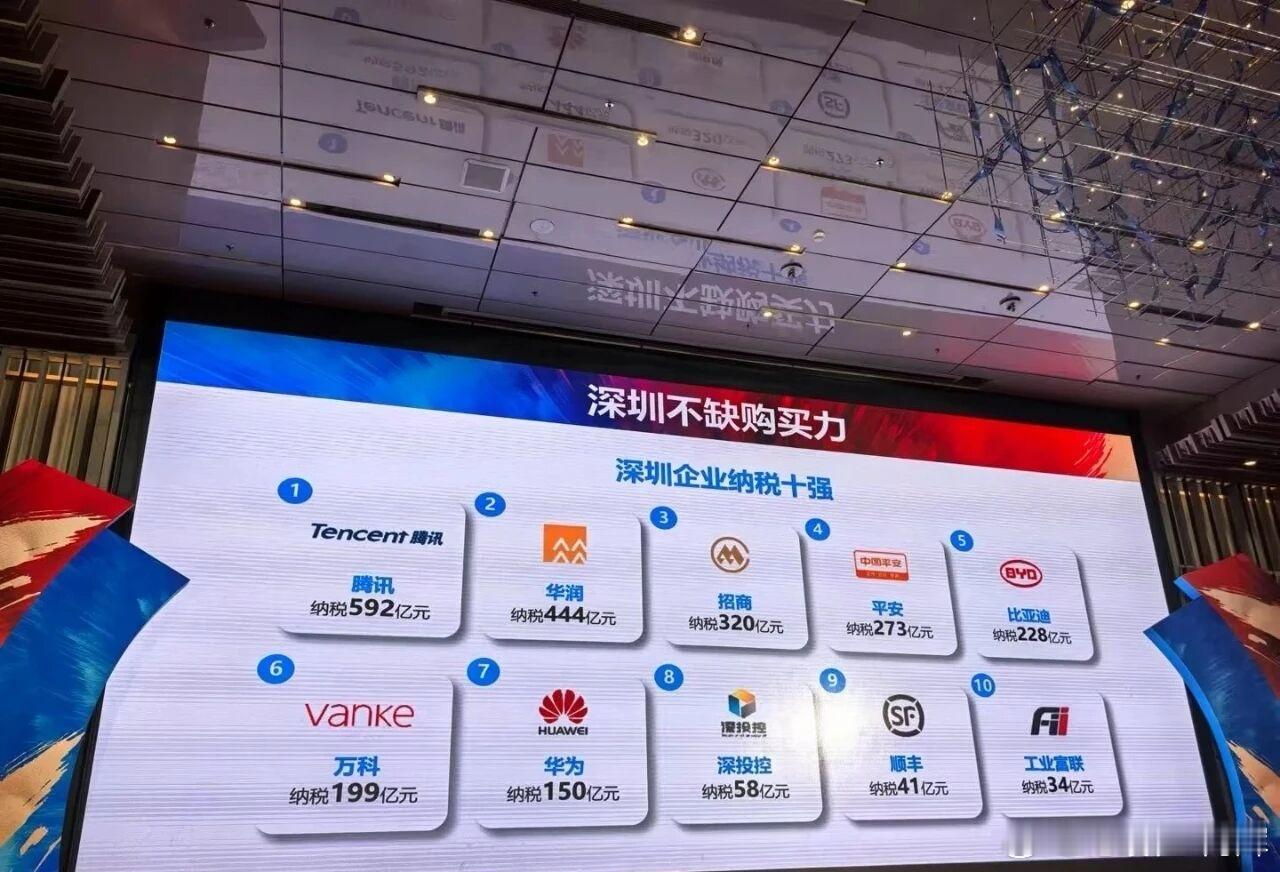 深圳企业纳税十强,比亚迪排名第五,腾讯是真的猛1. 腾讯:6602.57亿元,纳税592亿元,税收占比8.97%2. 华润集团:9295亿元,纳税444亿元,税收占比4.78%3. 招商银行:3375亿元,纳税320亿元,税收占比9.48%4. 中国平安:10300亿元,纳税273亿元,税收占比2.65%5. 比亚迪:7771.02亿元,纳税228亿元,税收占比2.93%6. 万科集团:3431.8亿元,纳税199亿元,税收占比5.80%7. 华为:8620.72亿元,纳税150亿元,税收占比1.74%8. 深投控:2713.8亿元,纳税58亿元,税收占比2.14%9. 顺丰控股:2844.2亿元,纳税41亿元,税收占比1.44%10. 工业富联:6091.35亿元,纳税34亿元,税收占比0.56%备注:营业收入和税收占比来自豆包