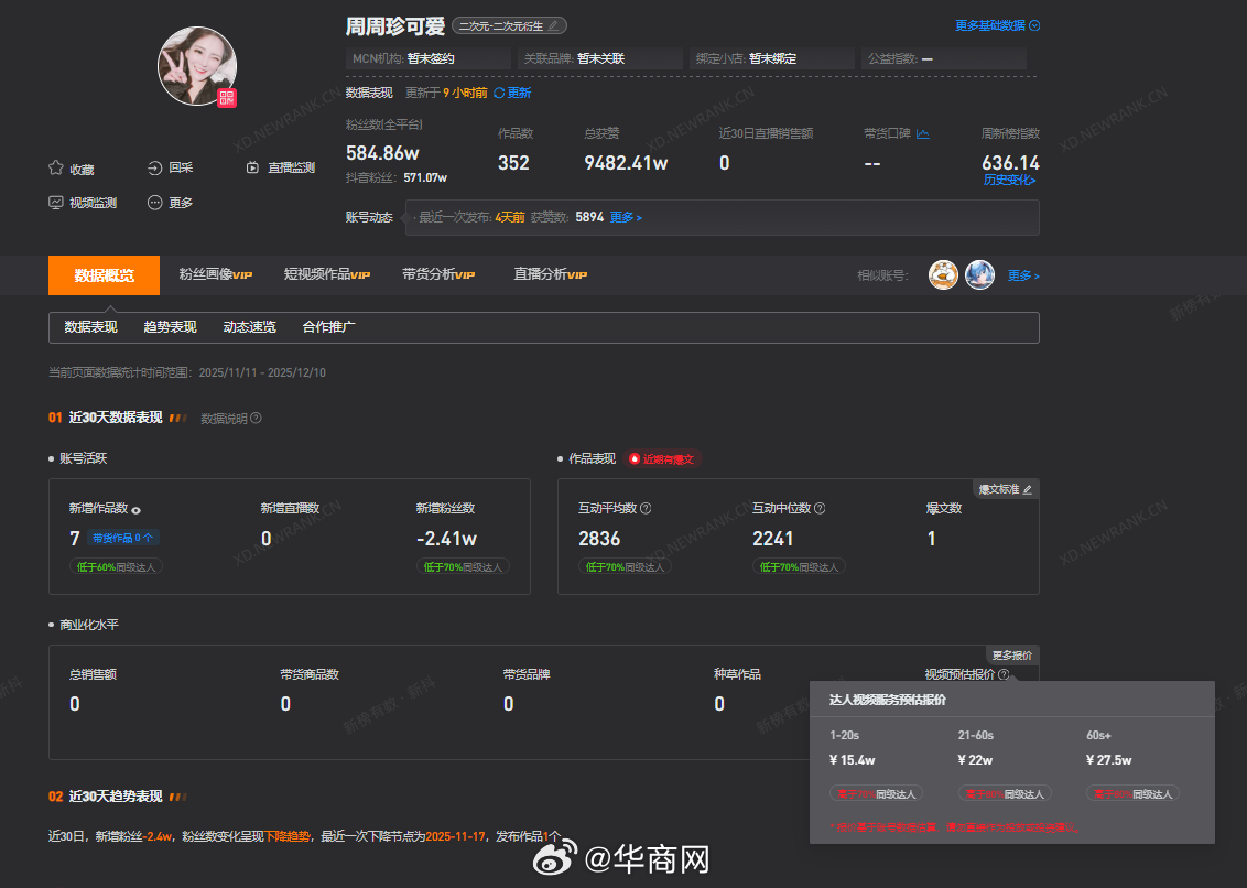 【#周周珍可爱60s广告报价27.5万#】近日,#5000万网红偷税漏税被实名举报# 登上热搜,查询第三方数据平台发现网名“周周珍可爱”实名信息“周珍”抖音粉丝584.86万,1-20秒视频报价为15.4万元,21-60秒视频报价为22万元,1分钟及以上视频报价为27.5万元。