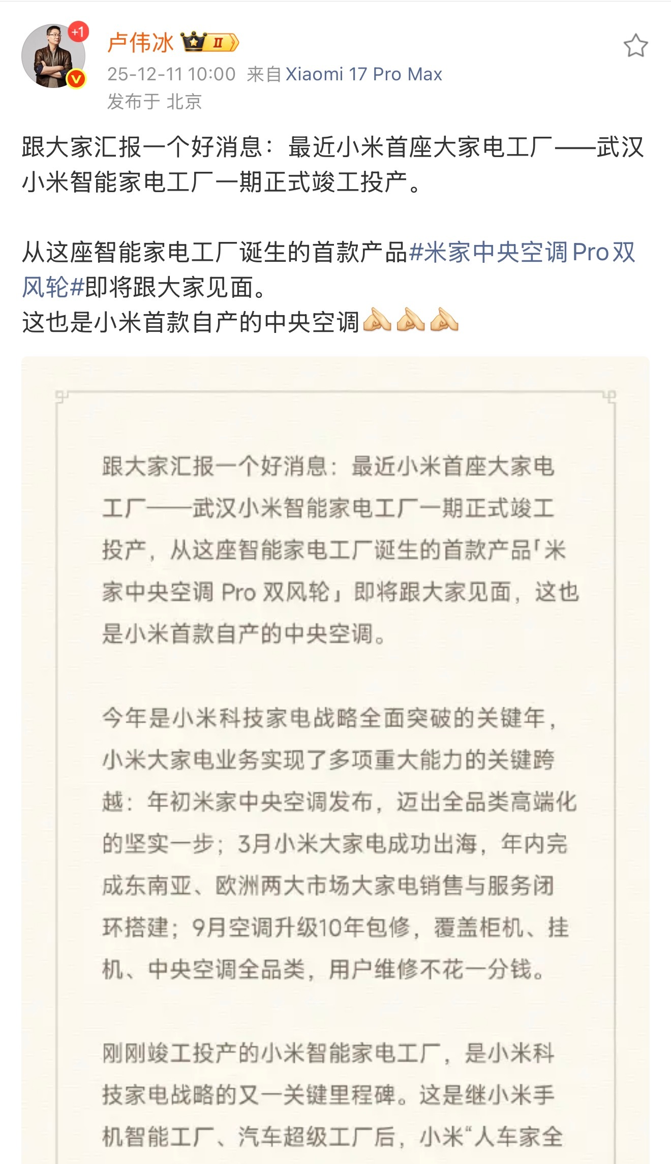 卢伟冰宣布小米将发布自产中央空调昨天我不是说去了小米武汉的大家电工厂嘛,新品敬请期待。好啦,今儿卢总就已经官宣了,接下来的空调新品就是这个工厂全链条自研自产自主生产的产品了,细心的朋友们估计已经知道了?现在小米已经手握三个工厂,汽车手机大家电全线覆盖,小米的来时路就是中国智造从追赶到领先的最佳缩影
