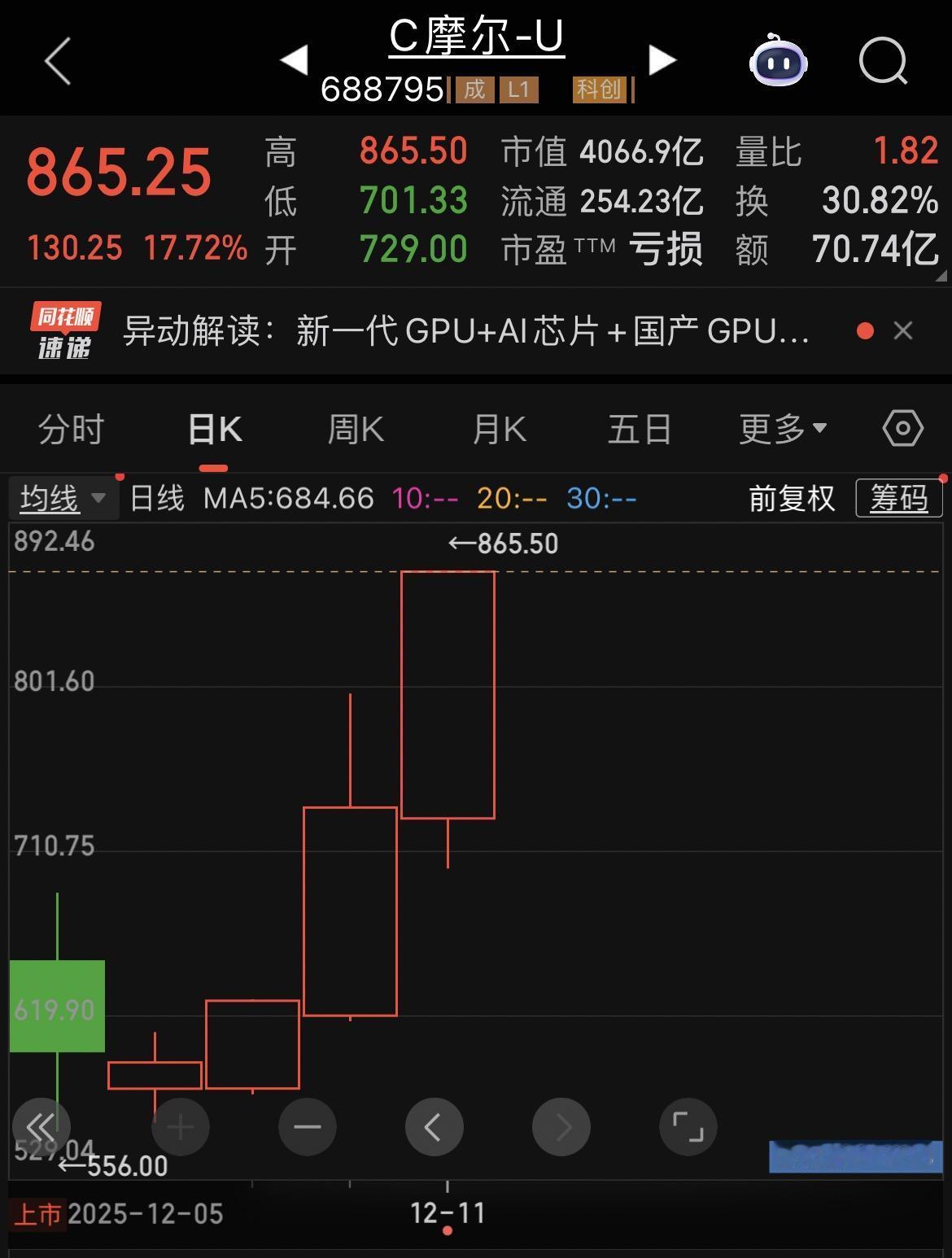 摩尔线程是真猛啊,昨天涨近17%,今天继续上攻,截至发文涨近18%,股价报865元,总市值突破4000亿元。 消息面上,12月19日-20日,摩尔线程举行2025年开发者大会,大会上将发布全新产品架构、技术及解决方案。 据了解,摩尔线程成立于 2020 年,以全功能 GPU 为核心,致力于向全球提供加速计算的基础设施和一站式解决方案。