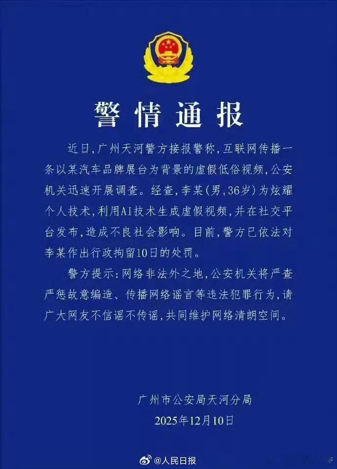 警方通报男子用AI伪造车展低俗视频大V聊车 兄弟,你的AI技术确实牛逼,只是非得这么证明自己么以后请用正确的途径展示技术