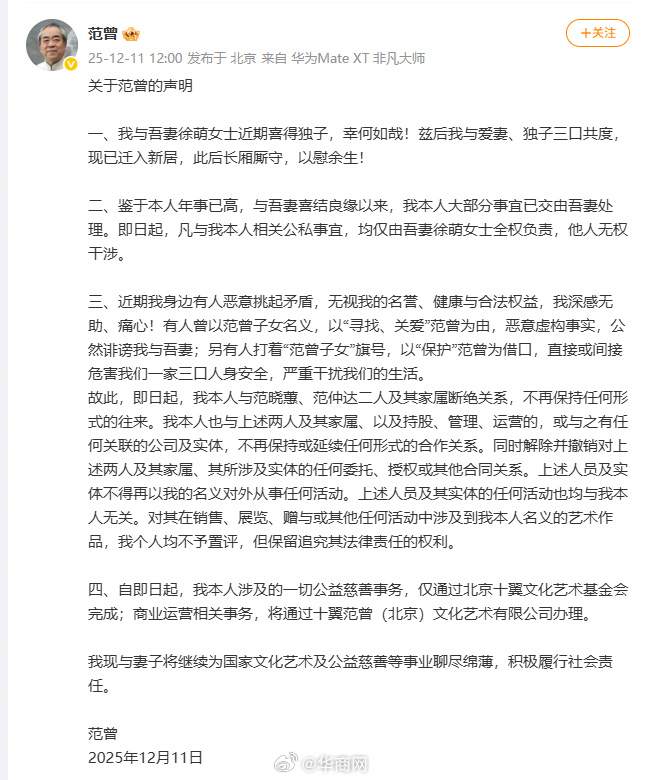 【#范曾宣布与范晓蕙范仲达断绝关系# 】#范曾宣布与女儿继子断绝关系# 12月11日,发文回应近期争议,其中提到:近期我身边有人恶意挑起矛盾,无视我的名誉、健康与合法权益,我深感无助、痛心!有人曾以范曾子女名义,以“寻找、关爱”范曾为由,恶意虚构事实,公然诽谤我与吾妻;另有人打着“范曾子女”旗号,以“保护”范曾为借口,直接或间接危害我们一家三口人身安全,严重干扰我们的生活。故此,即日起,我本人与范晓蕙、范仲达二人及其家属断绝关系,不再保持任何形式的往来。我本人也与上述两人及其家属、以及持股、管理、运营的,或与之有任何关联的公司及实体,不再保持或延续任何形式的合作关系。同时解除并撤销对上述两人及其家属、其所涉及实体的任何委托、授权或其他合同关系。上述人员及实体不得再以我的名义对外从事任何活动。上述人员及其实体的任何活动也均与我本人无关。对其在销售、展览、赠与或其他任何活动中涉及到我本人名义的艺术作品,我个人均不予置评,但保留追究其法律责任的权利。 #范曾发文回应#