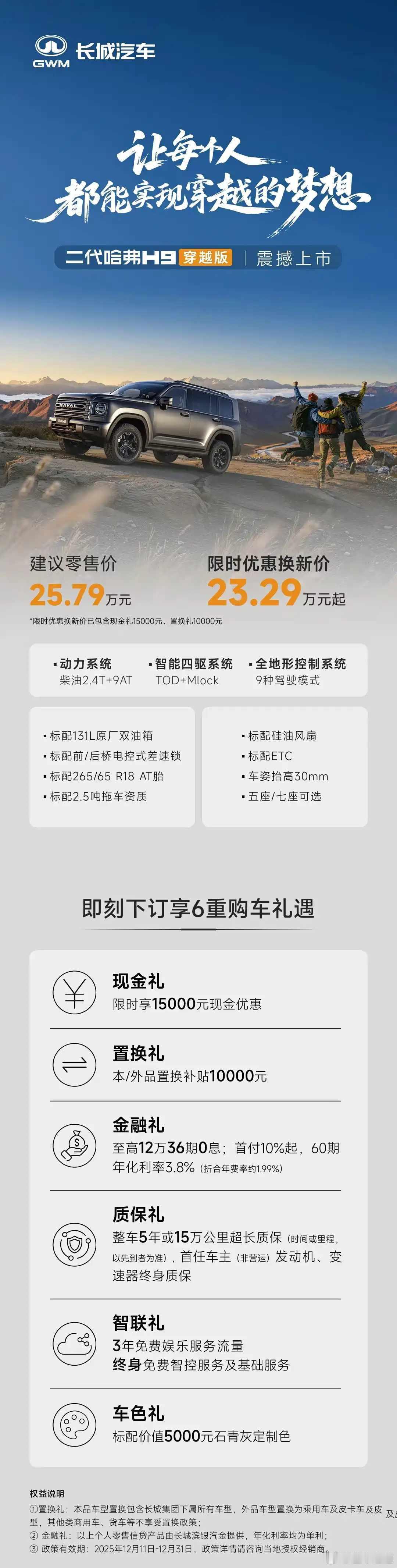 懂车之道讯12月11日,哈弗H9越版正式上市,该车官方指导价为25.79万元,限时优惠换新价23.29万元,购车可享6重礼,包括现金礼(15000元现金优惠)、置换礼(置换补贴10000元)、金融礼(12万36期0息等)、质保礼、智联礼和车色礼。动力方面,新车依旧搭载2.4T柴油发动机,最大功率137千瓦,峰值扭矩490牛·米,标配硅油风扇并配备131L原厂双油箱,续航可达1400km。传动系统匹配9速自动变速箱,前后桥电控限滑差速锁、博格华纳TOD适时四驱系统,其提供9种驾驶模式,其中新增岩石模式和专家模式,另外还具备2.5吨拖车资质。