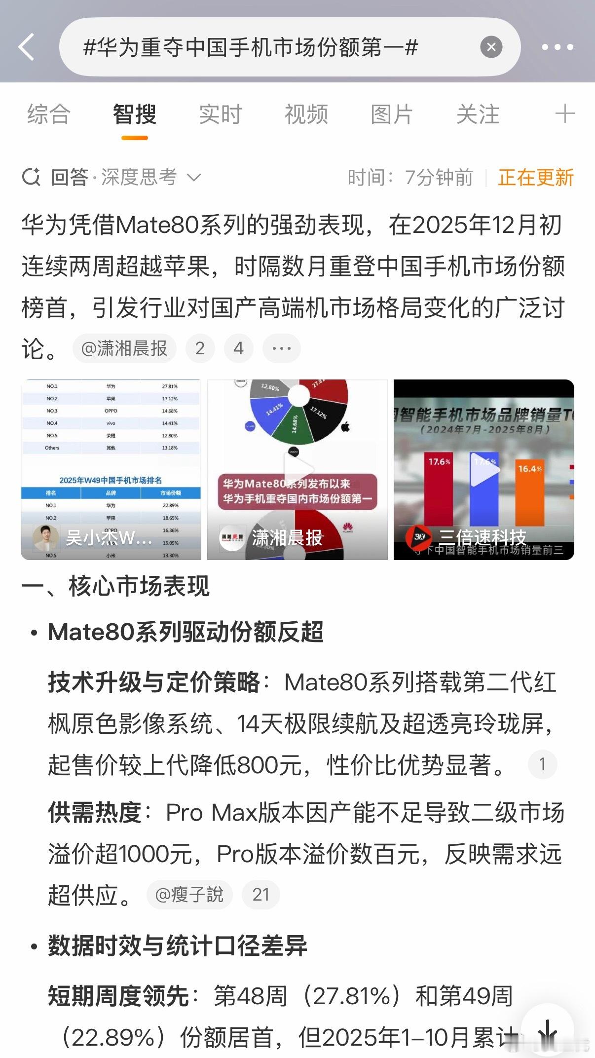 华为重夺中国手机市场份额第一自Mate80系列发布以来,华为已经连续两个星期市场份额超过苹果了。这还是货不多的情况下