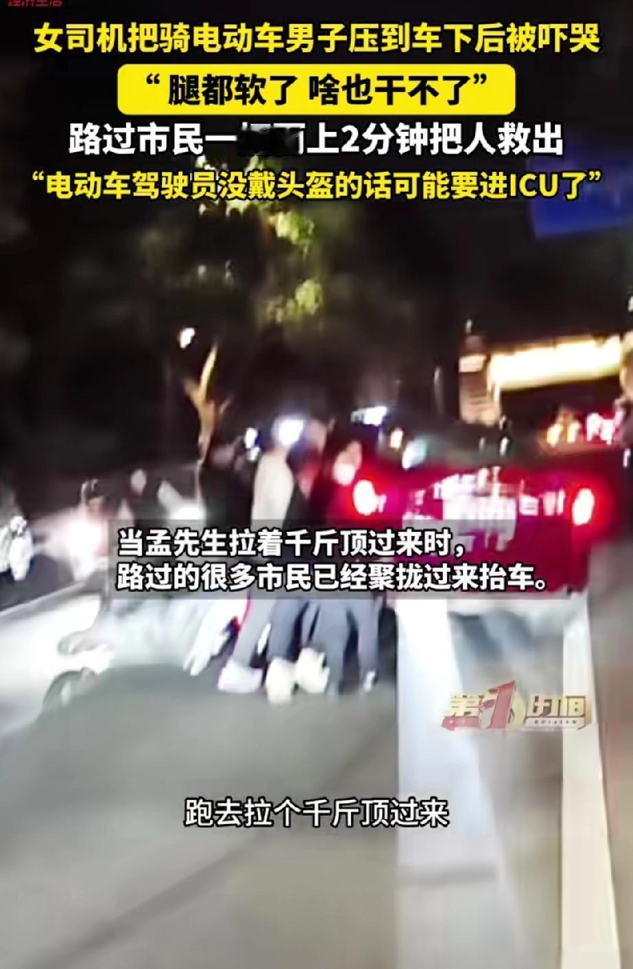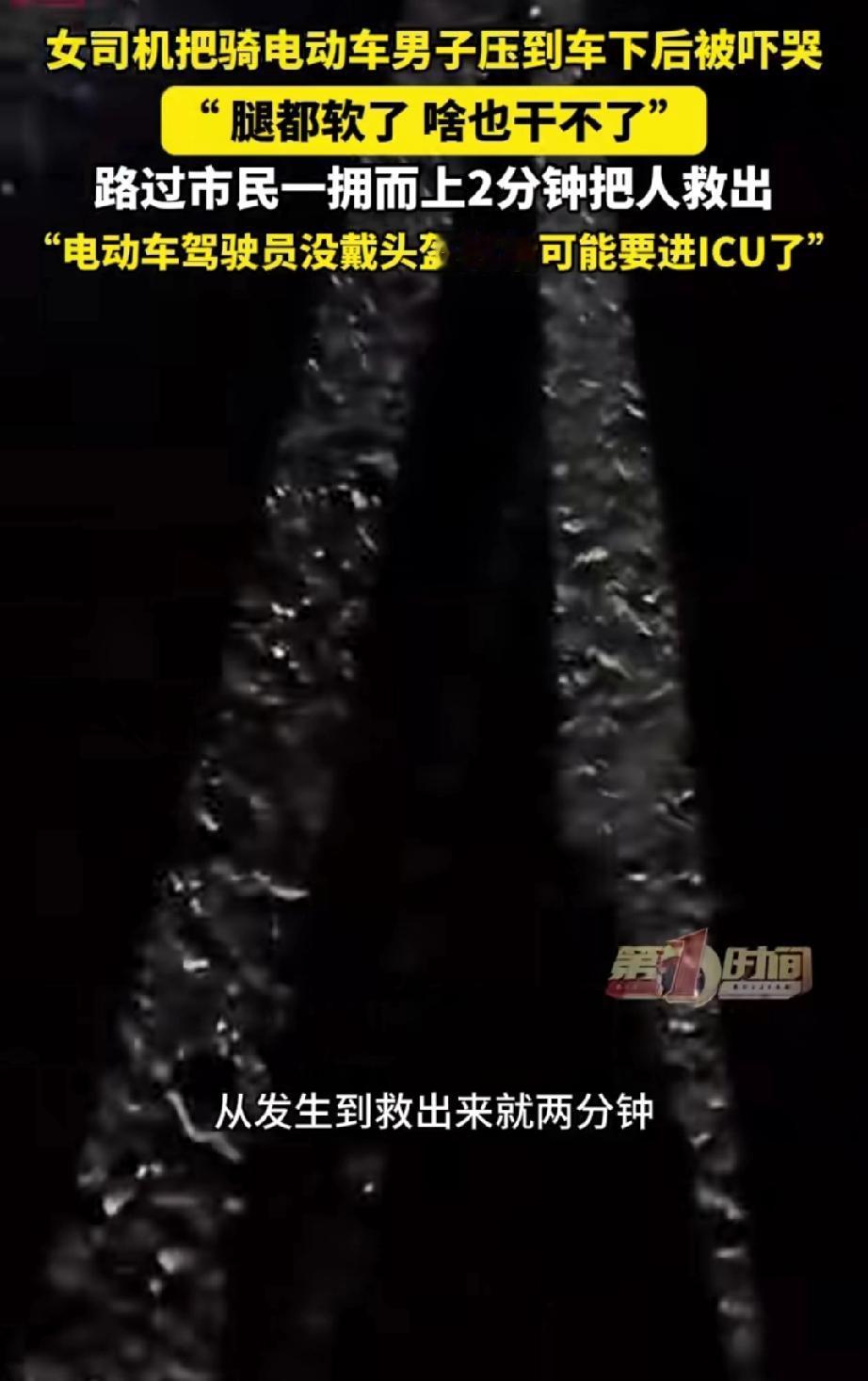 女司机驾车将骑电动车的男子撞倒,或许是太过紧张,汽车又往前挪动了一下,竟把男子卷入了车底。女司机下车后,目睹这一幕,吓得瘫软在地,放声大哭起来。 路过的行人纷纷围拢过去,商议着要把汽车抬起来,无奈人太少,难以成事。 这时,一位小伙发现路边恰好有一家洗车店,便赶忙跑去借来了千斤顶,将汽车顶起。 仅仅两分钟左右,男子成功脱困。幸亏他戴着头盔,头盔卡在汽车边缘,保护了头部,看样子并未受到严重伤害。 不过,参与救助的人从车底抬出男子之后,让他躺在地上别动,还拿背包给他垫着头,等待救护车的到来。 男子躺在地上,对着周围的人轻轻的说到:“谢谢。” 小伙对男子说:“万幸你戴了头盔,不然就要进ICU了。” 女司机也止住了哭声,颤抖着报了警。 这便是普通人的善良,当他人陷入危难之际,每个遇见的人都愿意伸出援手。这也得益于新闻的广泛宣传,让人们掌握了急救知识。 开车久了才懂:真正的“老司机”不是技术有多高,而是遇到危险时,心不乱、手不抖。慌乱只会让错误更快找上门,稳才能让危险慢慢远离。 来源:AHTV第一时间