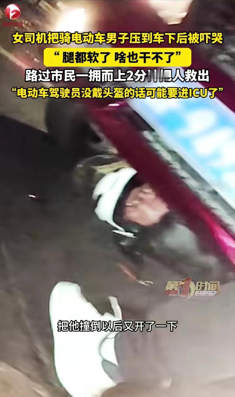 女司机驾车将骑电动车的男子撞倒,或许是太过紧张,汽车又往前挪动了一下,竟把男子卷