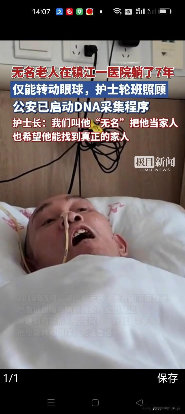 无名老人在医院躺了七年半!江苏句容这事儿太暖了。一个无名老人晕倒路边被送进医院,一住就是七年半。他没法沟通,只能转动眼球,医护人员却一直轮班照顾,把他当成家人。 这些年,白班夜班从未间断。医生判断他五六十岁,瘦瘦高高。医院和警方也一直没放弃找他家人,警察曾多方比对照片,却始终没线索。现在公安启动了DNA采集程序,或许离真相不远了。 不过也有人担心,就算找到了家人,对方还愿不愿意相认呢?但不管结果如何,医院和护士们七年半的坚守,已经是人间大爱了。