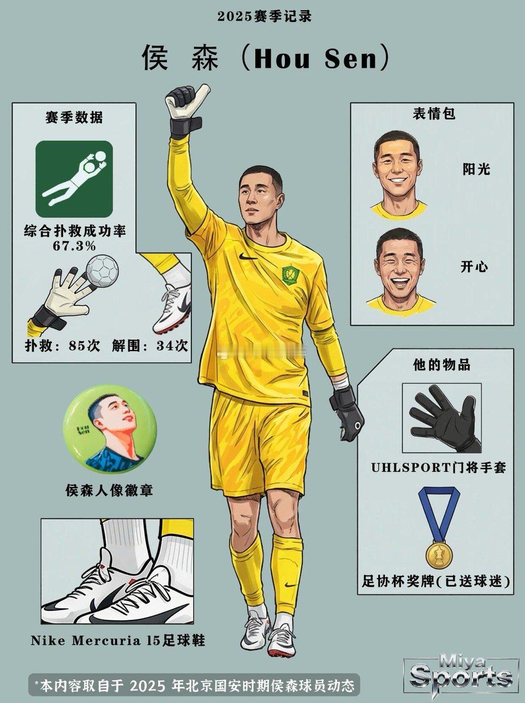 北京国安北京国安 北京孩子国安门将侯森!85次扑救稳如磐石本赛季北京国安的“门线守护者”侯森,直接把“稳”字焊在门框上了👏——国安战袍下的他,是国安后防最安心的屏障!🤲侯森的赛季数据太能聊了:综合扑救成功率67.3%85次飞身救险🥅34次关键解围🦾每一次伸手套球都是给球迷吃定心丸!这反应速度,说是装了“动态捕捉系统”不过分吧?赛场外的他更是圈粉体质:阳光笑眼+咧嘴开心的表情包,是国安队的“快乐源泉”;连足协杯奖牌都直接送给球迷,这宠粉程度直接拉满❤️!足协杯两次点球大战救主,拖着国安进入下一轮⚽,决赛嘴部受伤依旧坚持作战,赛后和韩佳奇说“交给你了!”真让人泪目🥹!国安球迷说,这赛季的侯森😊,是不是中超门将里的“天花板”?……Miya Sports