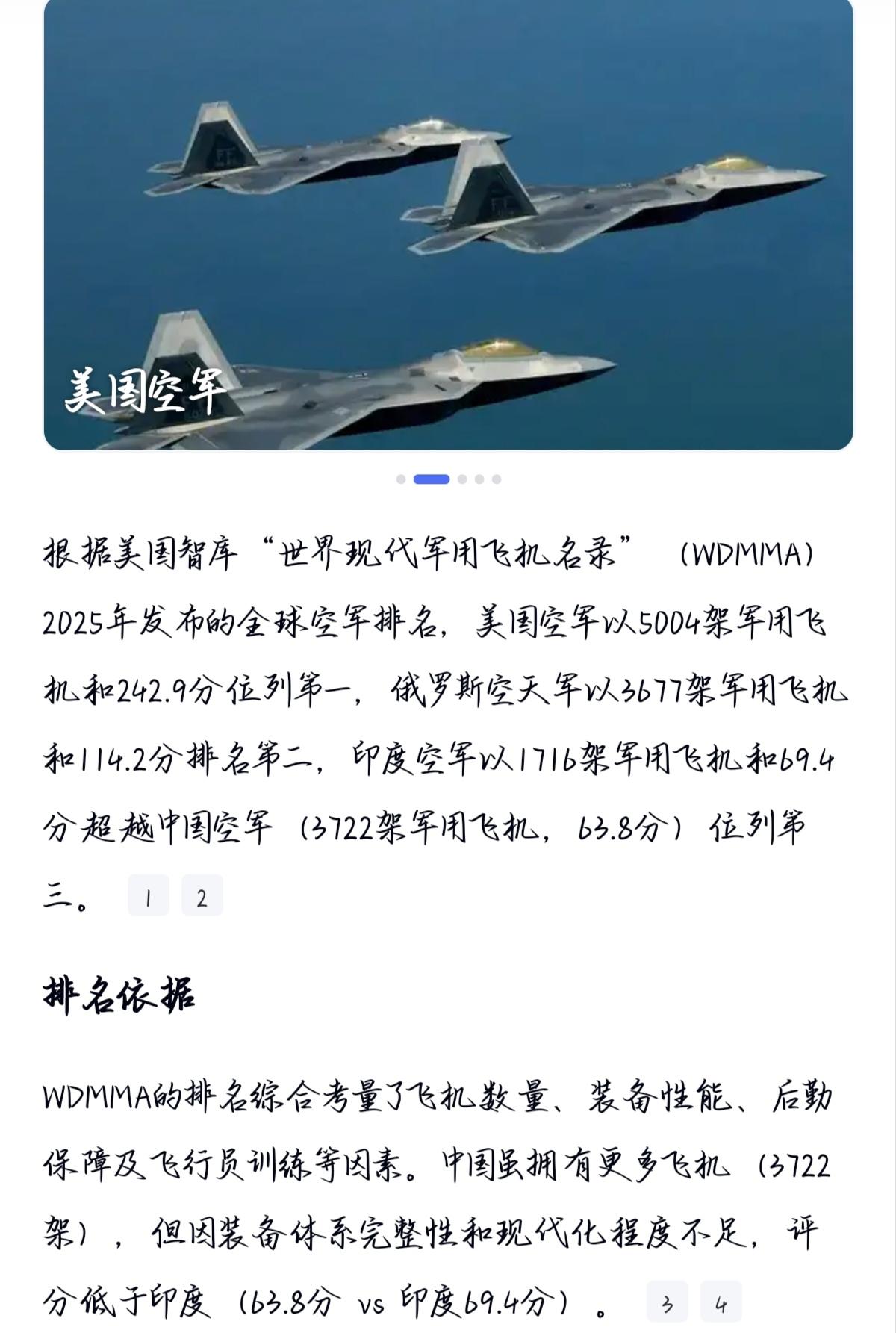 美国智库“世界现代军用飞机名录”(WDMMA)发布的最新排名,印度在美国和俄罗斯之后排名第三,中国则排名第四。歼十:三啊,你说为啥别人都叫我打印机啊?低情商这是美国对印度的捧杀,高情商邪恶栀子计划让他们盲目自信从而觉得自己又行了来对付中国