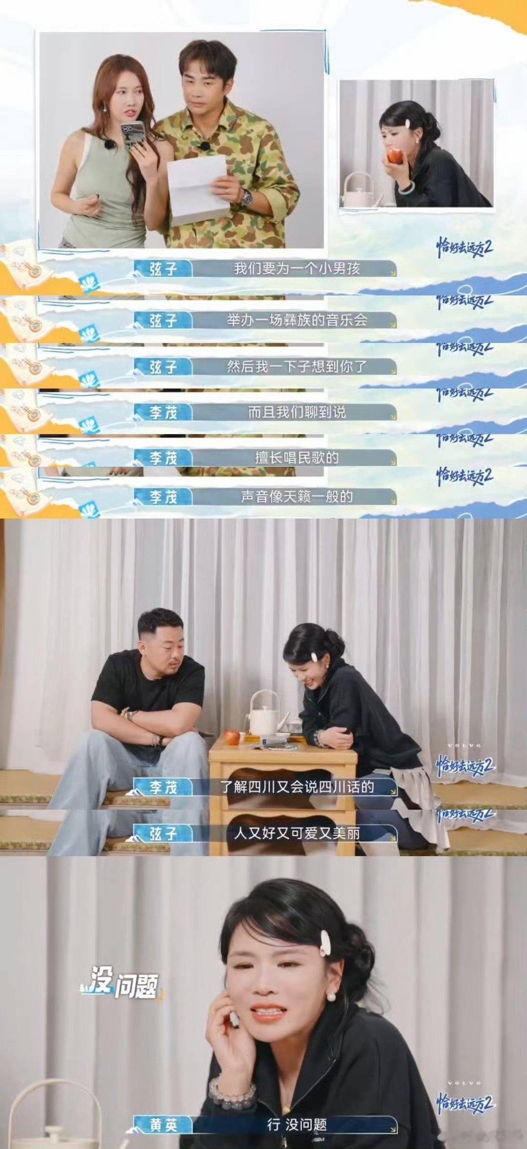弦子李茂一个电话把黄英夫妇哄上综艺 弦子李茂电话联系黄英夫妇,先把黄英的四川民歌夸成天籁,又赞她颜值高且可爱。曹帅不等黄英细想,直接答应帮忙,场面欢乐。
