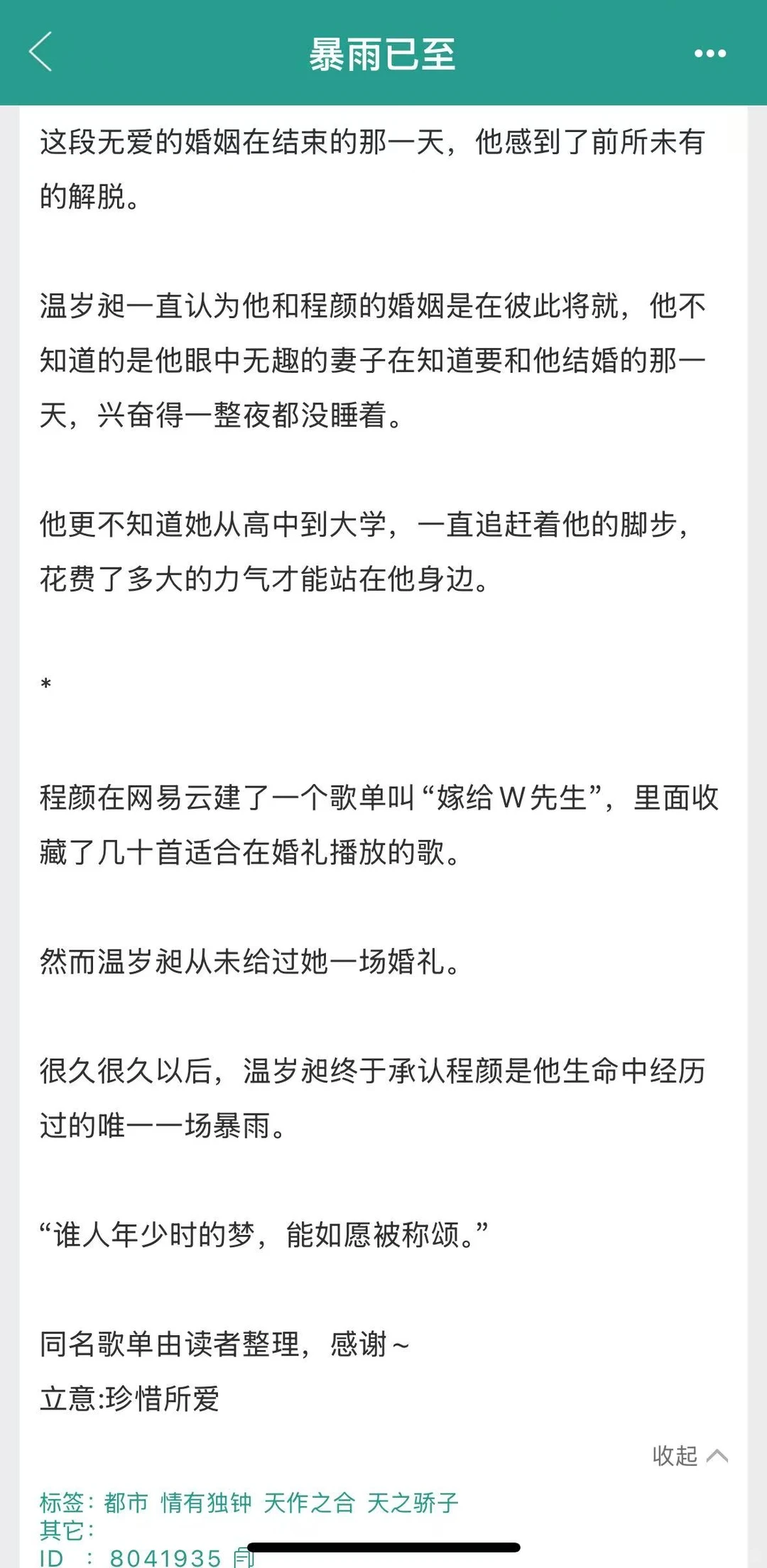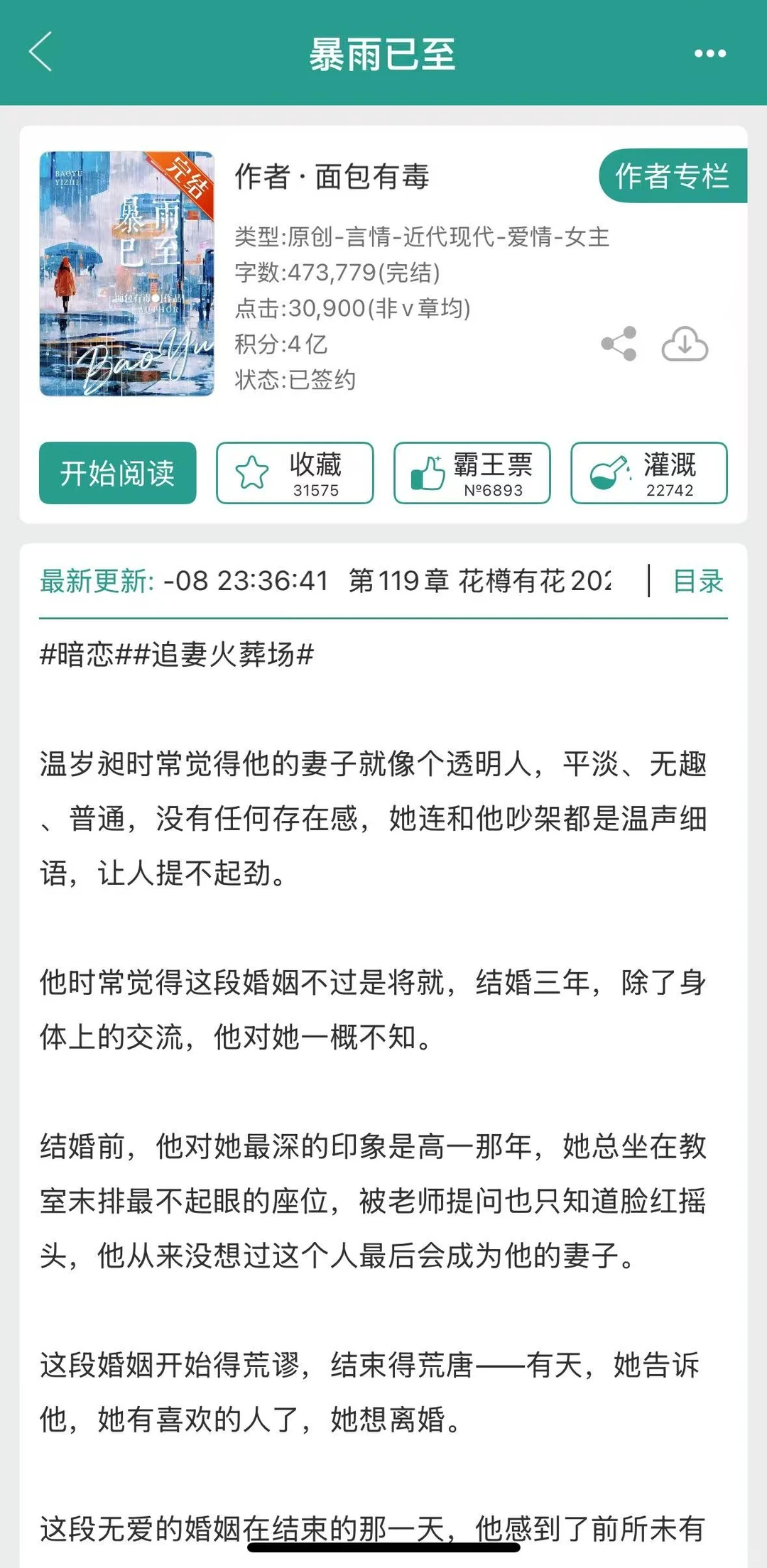 [氛围感R]《暴雨已至》,作者:面包有毒 [氛围感R]自卑敏感 x 高冷寡言 [氛围感R]现言/暗恋/追妻/1V2/成长/婚姻 [种草R]乍一看还挺虐,但其实就是一个自卑敏感的女性如何在一段关系里吸取教训,自我成长,成为更好的自己,然后在选择想要的生活的故事。 [种草R]故事主要聚焦在女主身上,以女主的感情线和事业线为故事重点,感情线上女主有3段故事,从每一段感情中,女主都在逐渐完善原来那个缺失的自我;故事线主要聚焦女主的成长。通篇下来,还是蛮值得一读的。