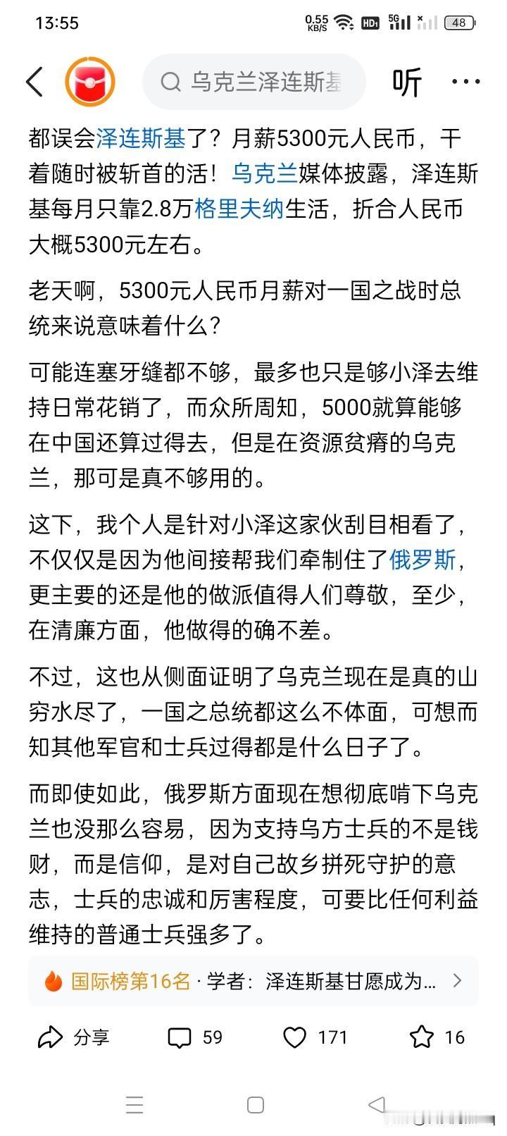 令人不可思议! 以前的网络上,曾经有乌克兰总统泽连斯基贪污腐败,他的妻子叶莲娜·泽连斯卡娅花几百万美元在欧洲买别墅等等,当时实在是感觉到让人无法相信。 因为泽连斯基为了乌克兰国家,甚至是将生死都置之度外,怎么可能会在国家困难重重的抵抗战争时期大肆贪污钱财。但是,如果说泽连斯基个人有部分、甚至是不菲的钱财,也有可能,因为他在任乌克兰总统之前,毕竟曾经是一个有相当影响力的演员,并且有自己的演出公司,而演员或演出公司的收入大概大多都是比较丰厚的。如果泽连斯基非常喜欢钱,干嘛放弃演出而去做什么收入微薄的总统呢! 现在,突然在网络上看到一个消息,说是乌克兰总统泽连斯基每月的工资只有2.8万乌克兰格里夫纳,折合人民币5300元。估计这点钱对泽连斯基似乎就是杯水车薪,不足挂齿。好在,大约泽连斯基目前的所有的活动,都是公务性,开支自然是国家的公务支出。他没有时间也没有兴趣,去花很多功夫和时间去考虑自身私人的事情。