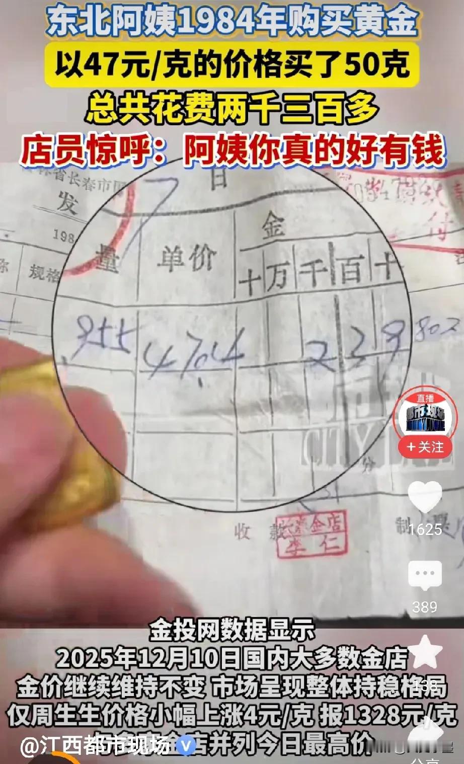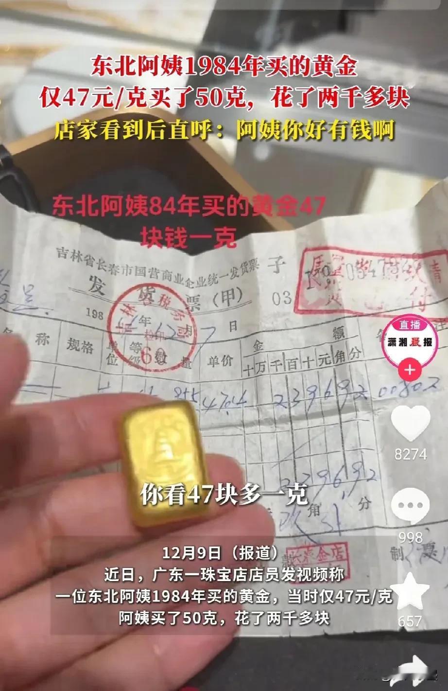 1984年时的黄金每克才47元,这位东北阿姨当时豪掷2300多元买了一块50克的黄金。现在黄金价格涨到每克1000多元,这块黄金能值5万多了! 这也反映出钱的购买力下降了20多倍,80年代的1块钱相当于现在的20多块钱! 这位阿姨在那个吃不饱的年代,能花2000多买黄金,足以说明阿姨家境非常殷实!