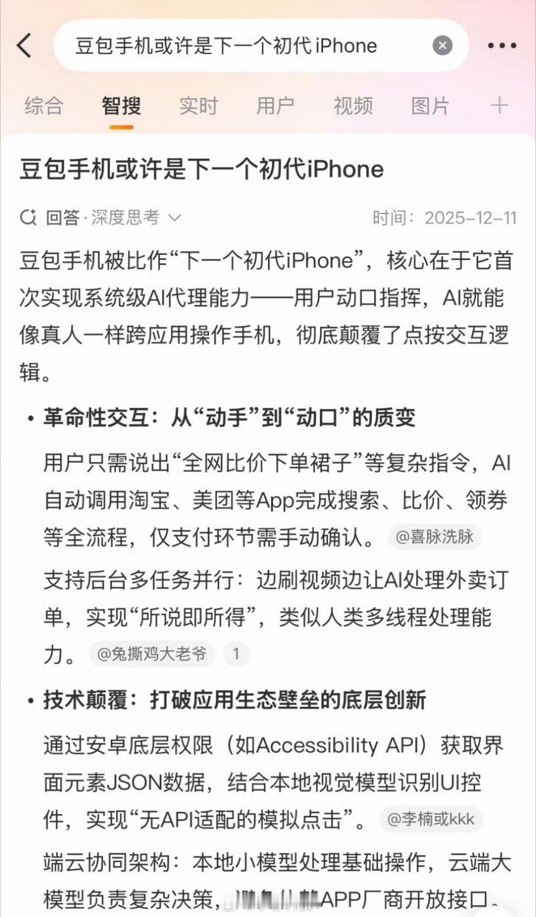 随着最近豆包手机大火,被一些人认为豆包手机是下一代初代iPhone,大家同意嘛?首先,初代iPhone是什么?初代iPhone是乔布斯开创的电容触摸时代手机,将传统的按键手机彻底打破,将软硬交互形式改变成纯触摸交互,是划时代的产品,改变了手机形态和用户的交互逻辑而豆包手机只是一个ai指令集合操作的正常智能机,首先在硬件上没有什么改变,只是在用户交互行为上从不摸到语音口令,但是还是需要不摸确认,并不能完全脱机触摸,而且只是限定了部分使用场景,比如游戏拍照剪辑等场景都还依赖认为操作,所以大家觉得这样的改变能和初代iPhone媲美嘛豆包手机或许是下一个初代iPhone豆包手机或许是下一个初代iphone