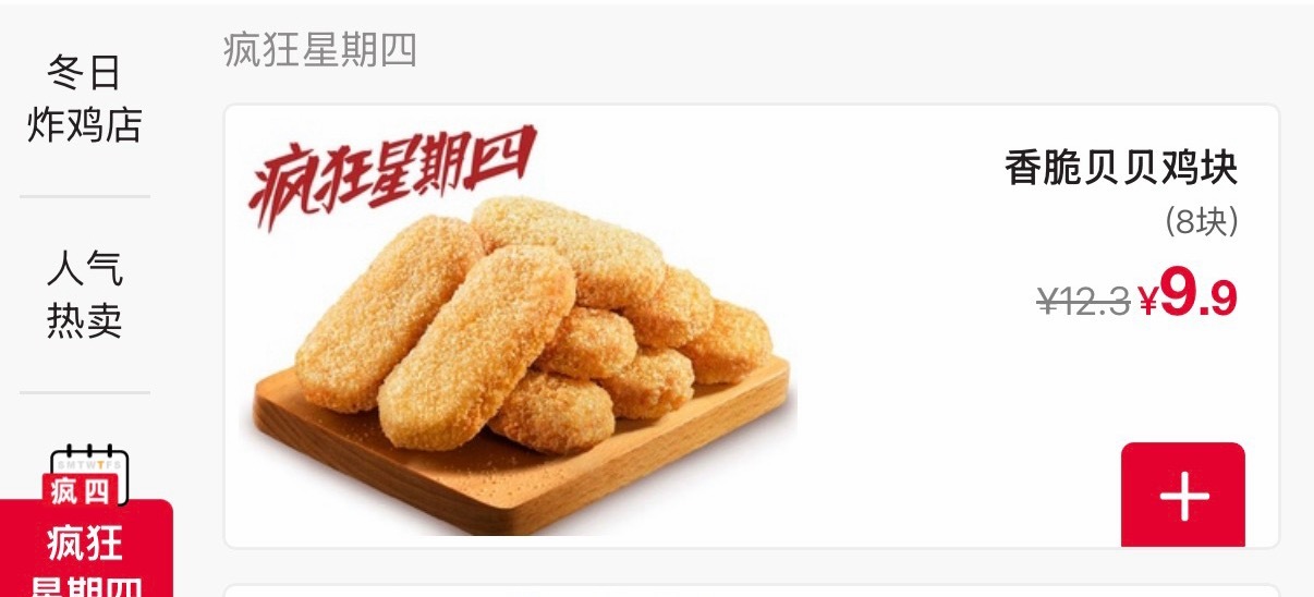 今天的疯狂星期四看到一款我没有吃过的香脆贝贝鸡块作为老基友的我哪能忍,打算待会去吃吃,应该不会踩坑吧