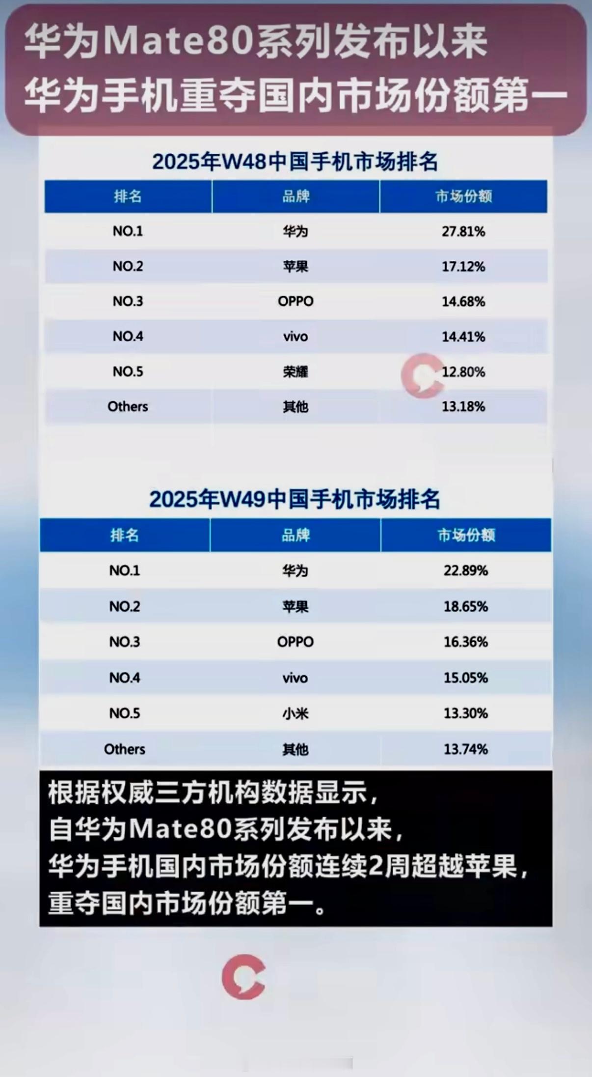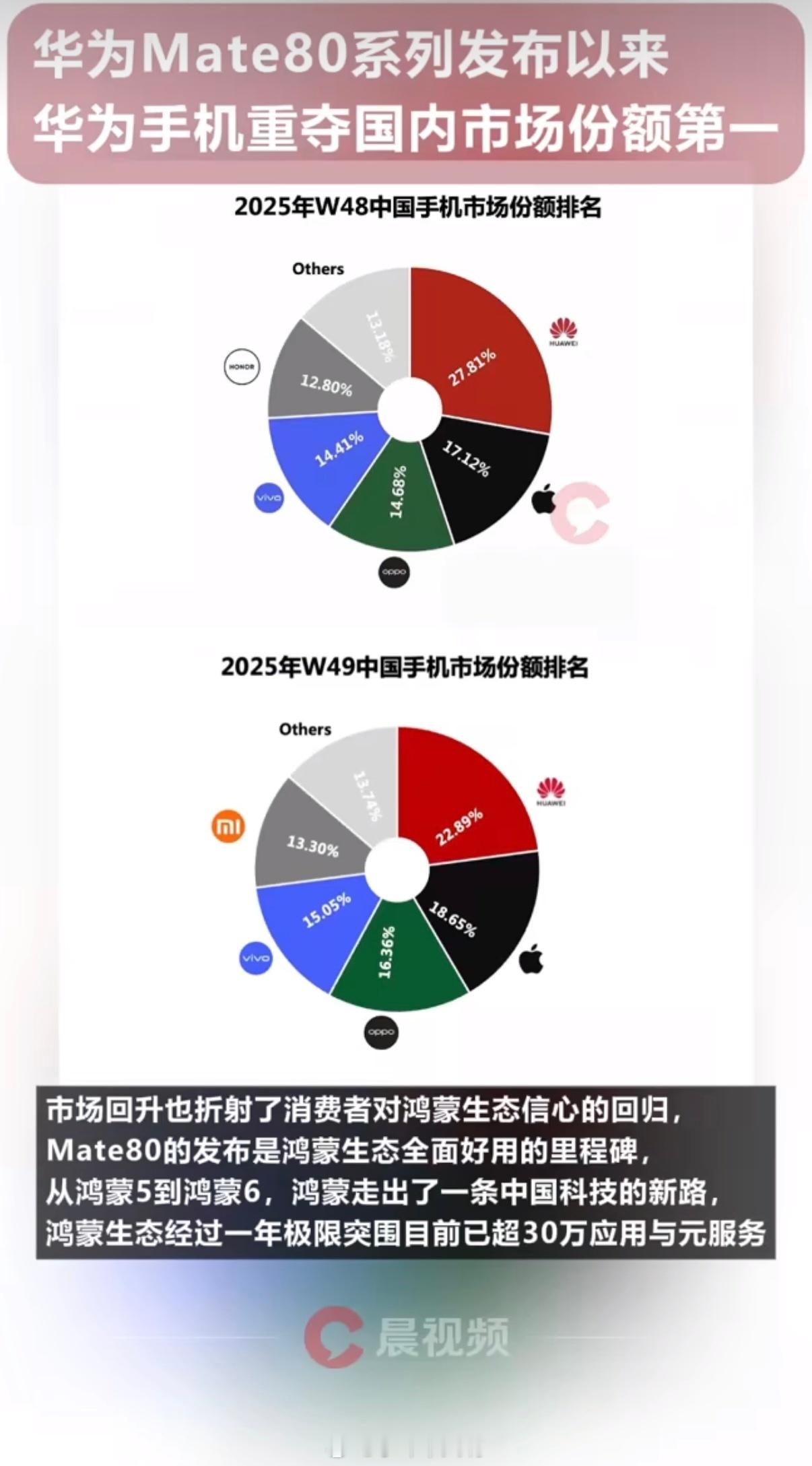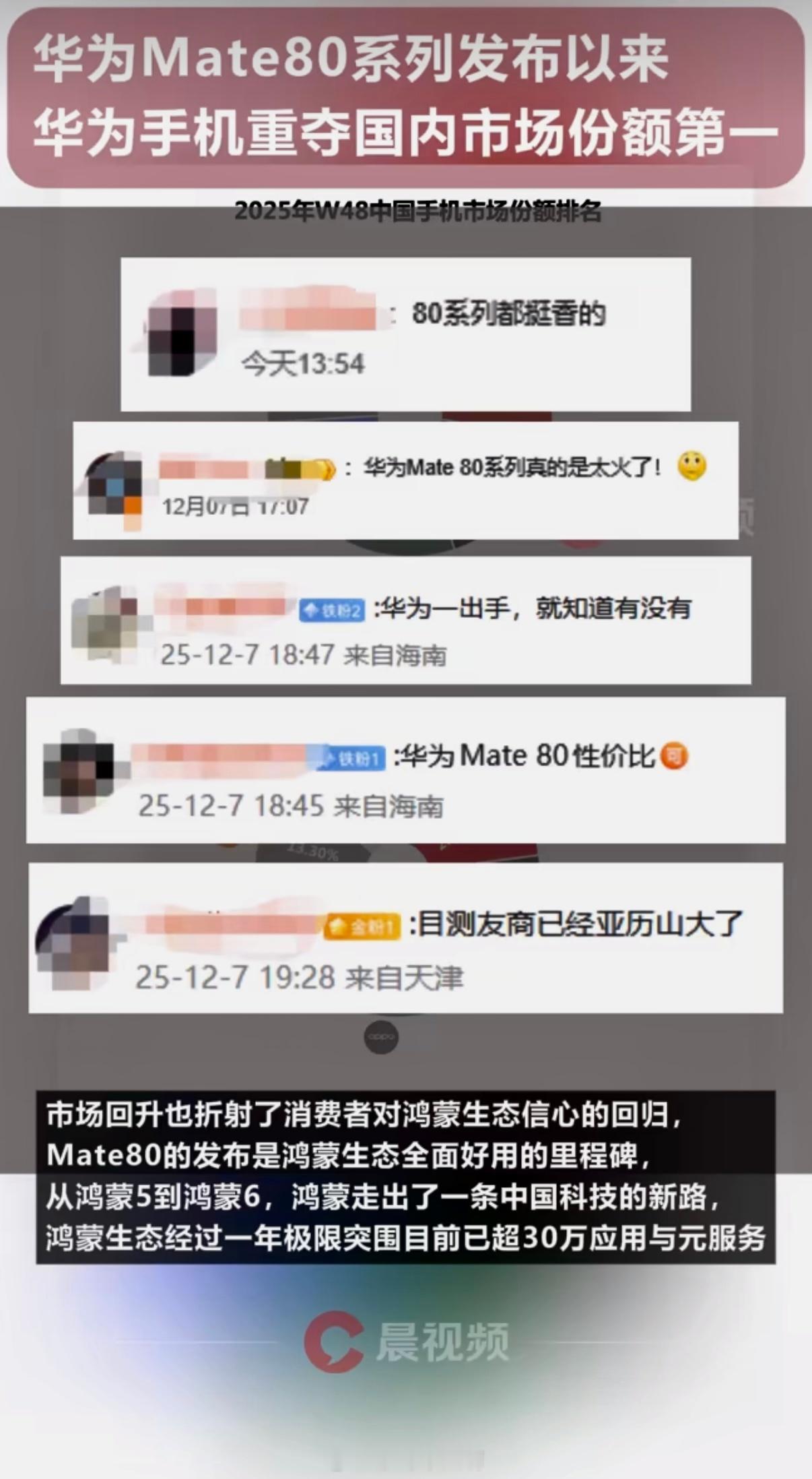华为杀回第一!Mate 80系列上市后,连续两周国内市场份额超越苹果,重登中国手机市场榜首。