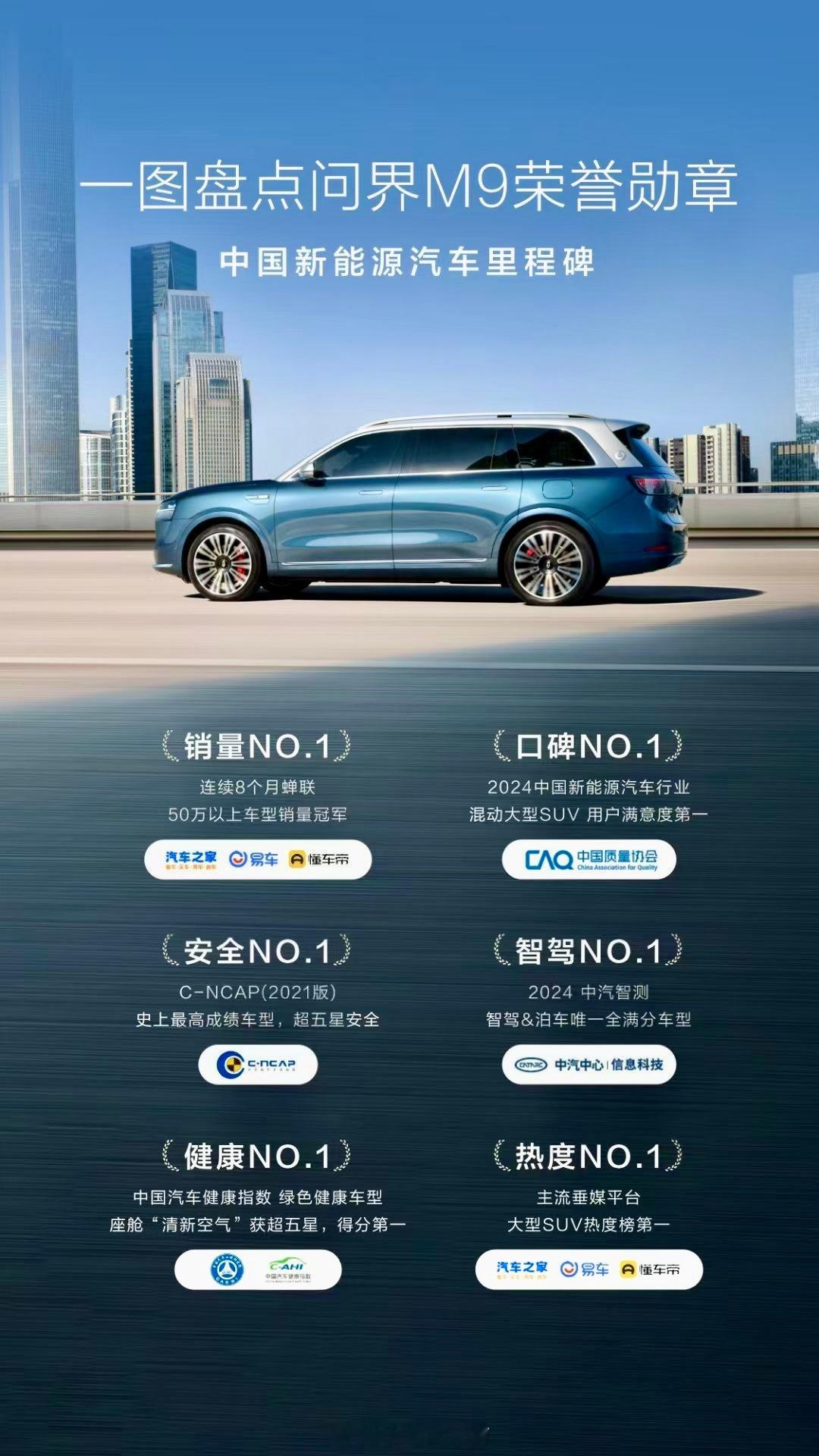 问界作为中国高端新能源汽车的代表,已在销量、口碑、保值率、安全、智驾、健康环保和市场热度等七大核心领域全部拿下行业第一,全面领跑智能汽车赛道。- 销量第一:问界M9连续多月稳居50万元以上豪华SUV销量冠军,累计交付超26万台,占据该价格段新能源市场70%的份额。 - 用户口碑第一:全系车型净推荐值(NPS)高达85.2分,在主流新能源品牌中排名第一。 - 保值率第一:M9上市仅9个月,就在新能源全品类中保值率最高,甚至超过传统豪华品牌。 - 安全性能第一:M9获得C-NCAP(2021版)“超五星”安全认证,并在2024年中汽测评中创下历史最高分,是唯一在智能驾驶和自动泊车项目中拿满分的车型。 - 智能驾驶第一:搭载的乾崑智驾ADS 4.0系统,在中汽中心评测中获满分,智驾可靠性和累计测试里程均居行业前列。 - 健康环保第一:M9荣获中国汽车健康指数“绿色健康车型”认证,座舱空气质量得分全行业第一。 - 市场热度第一:在汽车之家、懂车帝等主流平台,问界全系长期霸榜,M9更是稳居大型SUV热度榜首。问界M9不仅卖得好、用户夸得多,还更保值、更安全、更聪明、更健康,热度也一直居高不下——真正做到了“七项全能”。