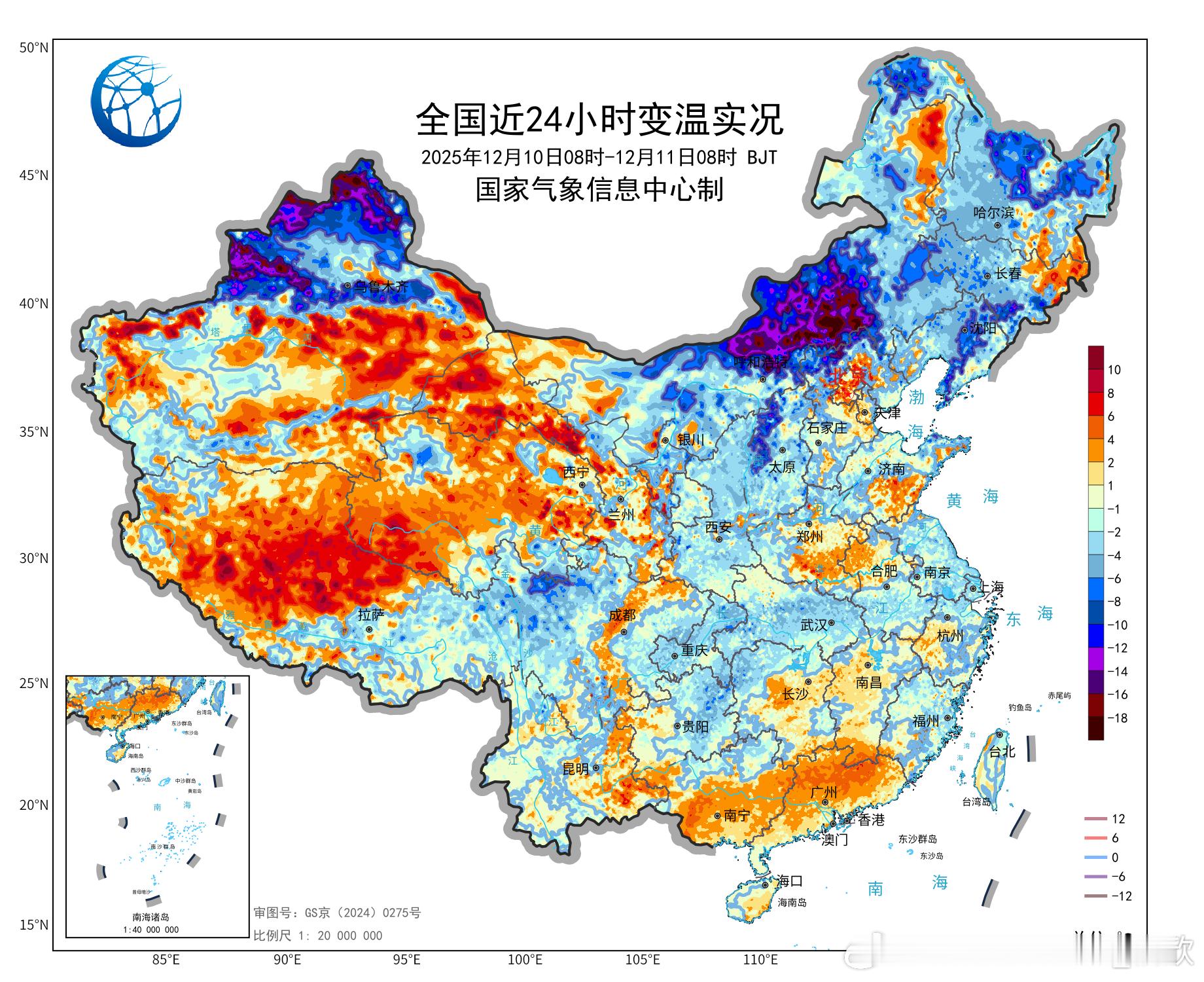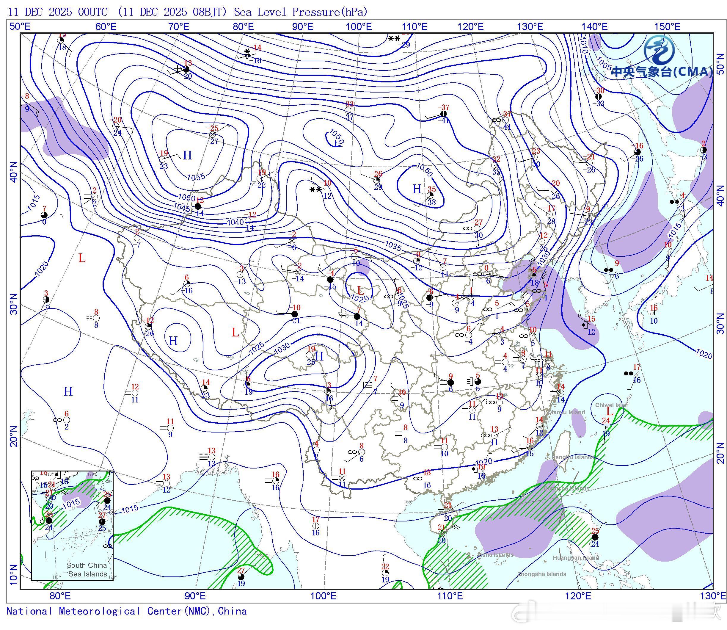 【寒潮】今晨寒潮主力冷空气,导致新疆北部出现明显降温,乌鲁木齐老国家站,截至8时最低气温降至零下11.8℃,创今冬以来新低。内蒙古中部一带,今晨也剧烈降温,这是寒潮先遣团的影响,对应形势场上有两个冷高压。今晨黑龙江漠河最低零下37.7℃,创黑龙江今冬以来,国家气象站新低。未来东边的先遣团会南下,与西边的寒潮冷空气主力会师。因此未来从西北到华北再到江南华南多地,日平均或最低气温普遍下降6~10℃,新疆北部、甘肃、陕西南部、华北西部和南部、东北地区南部、江淮西部以及江南北部等地部分地区下降10~12℃,局地降温可达12~14℃。12月14日早晨,最低温度0℃线将南压至浙江南部、江西北部、湖北南部一带。西北地区东部、华北、黄淮到长江中下游多地的气温将创出立冬后新低。14日晨太原最低可能降至零下16℃,兰州降至零下14℃、北京降至零下10℃、济南和郑州降至零下6℃,南京在15日晨可能是下半年首次跌破0℃。