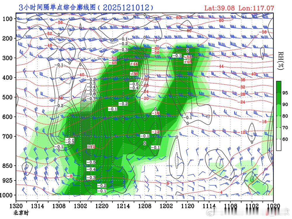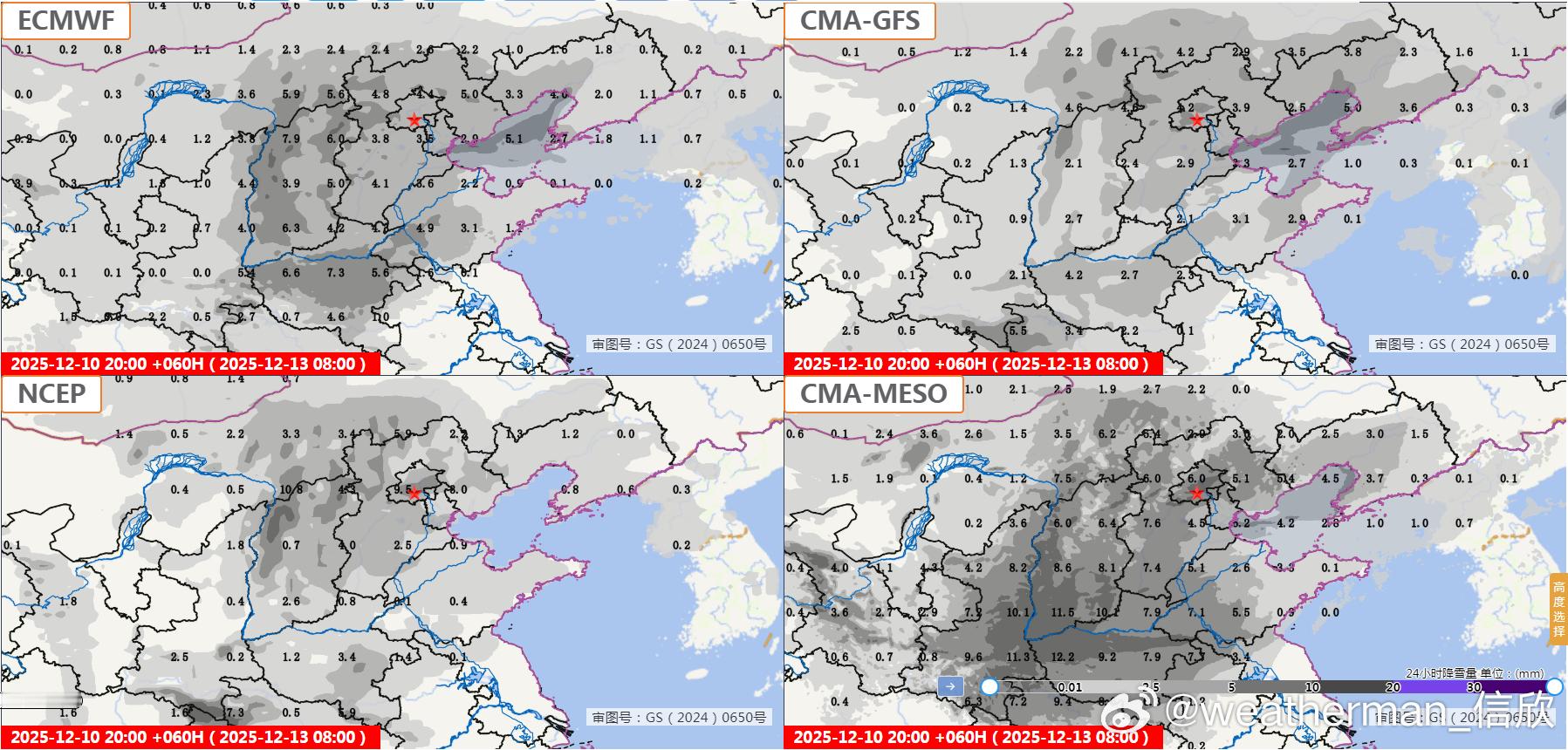 【降雪分析】图1为数值预报给出的11日20时-12日20时降雪量预报对比,图2为12日20时-13日20时的对比。图1-2,左侧上下两个为欧洲和美国数值,右侧上下两个为我国模式和我国中尺度模式。中尺度模式预报一直是偏强的。目前预报上,对于降雪强度还是有分歧,但有无的问题上,基本一致。图3-9为北京、天津、石家庄、太原、济南、郑州、呼和浩特的综合廓线图。图中绿色为高湿度区,虚线为动力抬升。两者配合,利于出现降水,图中红线为等温线,基本上近地面温度均低于0℃,因此降雪都没有悬念。北京的降雪主要还是在12日午后到夜间。天津主要在12日傍晚-13日凌晨。石家庄从11日晚可能就开始,中间可能有暂停,持续到12日傍晚。太原主要降雪在11日晚-12日下午,傍晚逐渐结束。济南因为低空有干区,降雪要等12日晚才开始,持续到13日晨。郑州降雪主要12日凌晨-傍晚,尤其是12日上午11时前后,水汽动力配合最佳,视觉上可能看到鹅毛大雪的情景。呼和浩特降雪主要在12日凌晨-下午。13日凌晨还有些补充的系统过境,不排除还有些弱降雪。