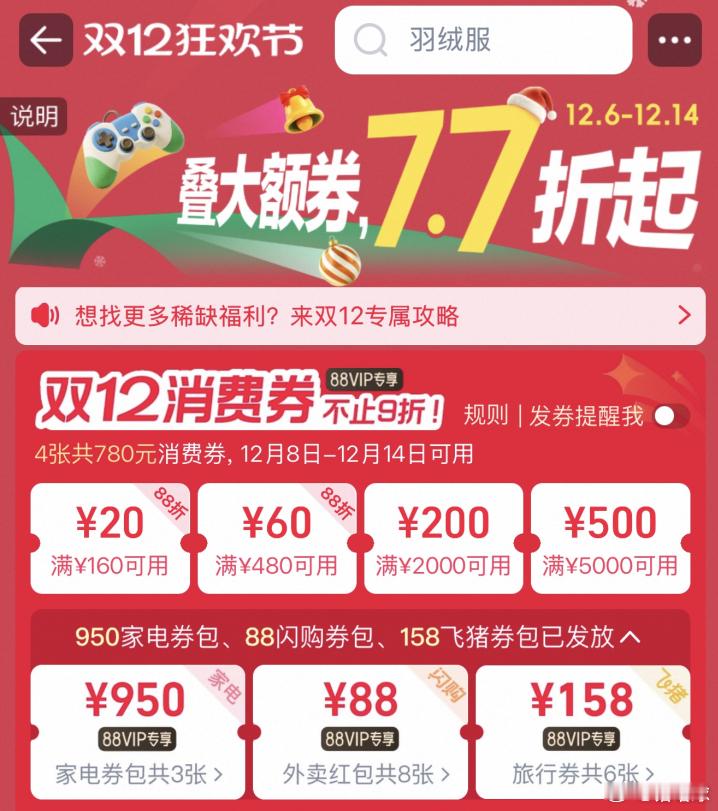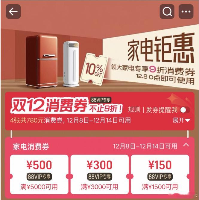 尊贵的88VIP看过来!780元消费券别放着等过期了,年底聚会要是打算给客厅换个取暖器的,950元的大家电消费券直接薅呀~双12上淘宝扫货价带走淘宝双12来了