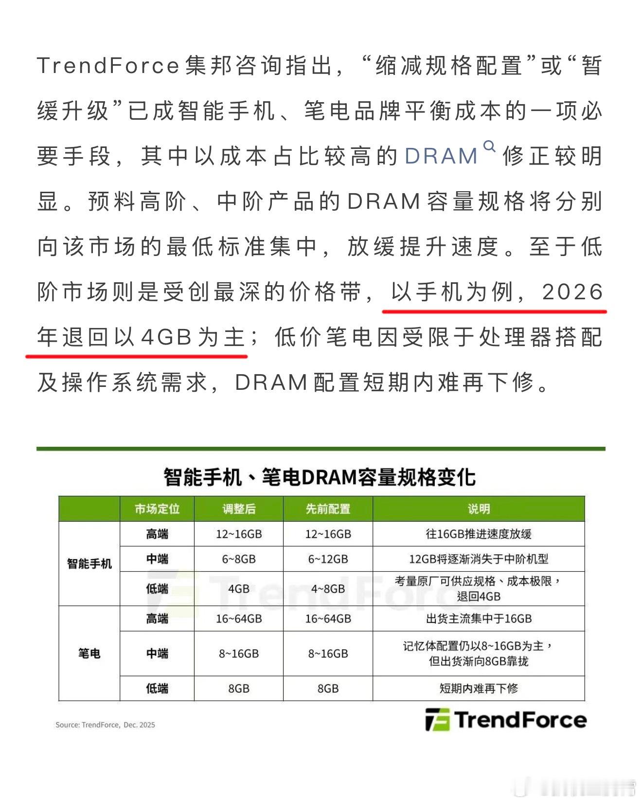 大家感受下现在内存涨的多离谱吧,调研机构TrendForce公布的数据来看,以手机为例,明年低端机将重回4GB RAM时代,中端机普遍4~8GB,12GB RAM都砍没了,高端机大概率得涨价,尤其16GB版本。看来内存一时半会儿价格真下不来了,有没有担心涨价今年赶着换新机的朋友?