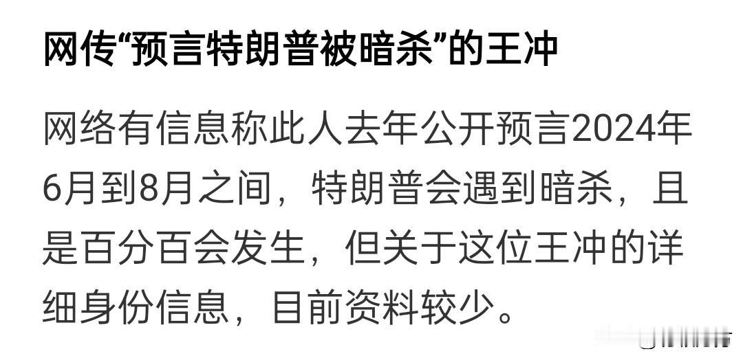 说一点怪力乱神的事儿,有一个叫王冲的人预测“有一个叫特朗普的人”活不过明年的1月20号,并请大家见证[笑哭]。头条AⅠ说这个王冲去年曾预测特朗普会遭暗杀,很有些神通的样子。 我对这类传闻向来是不大相信的,不过好在时间不长,离最后期限还有一个多月的时间,那就留个记录,看看到底能不能见证一个奇迹。[大笑]