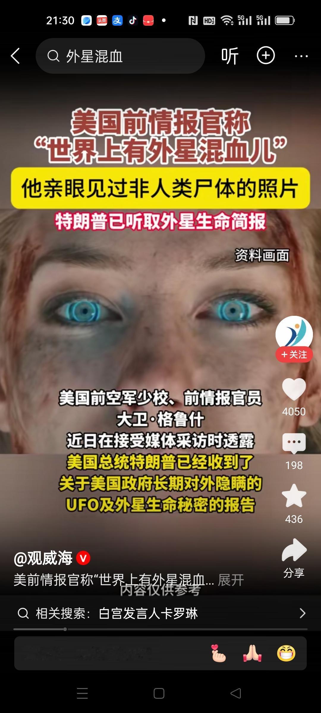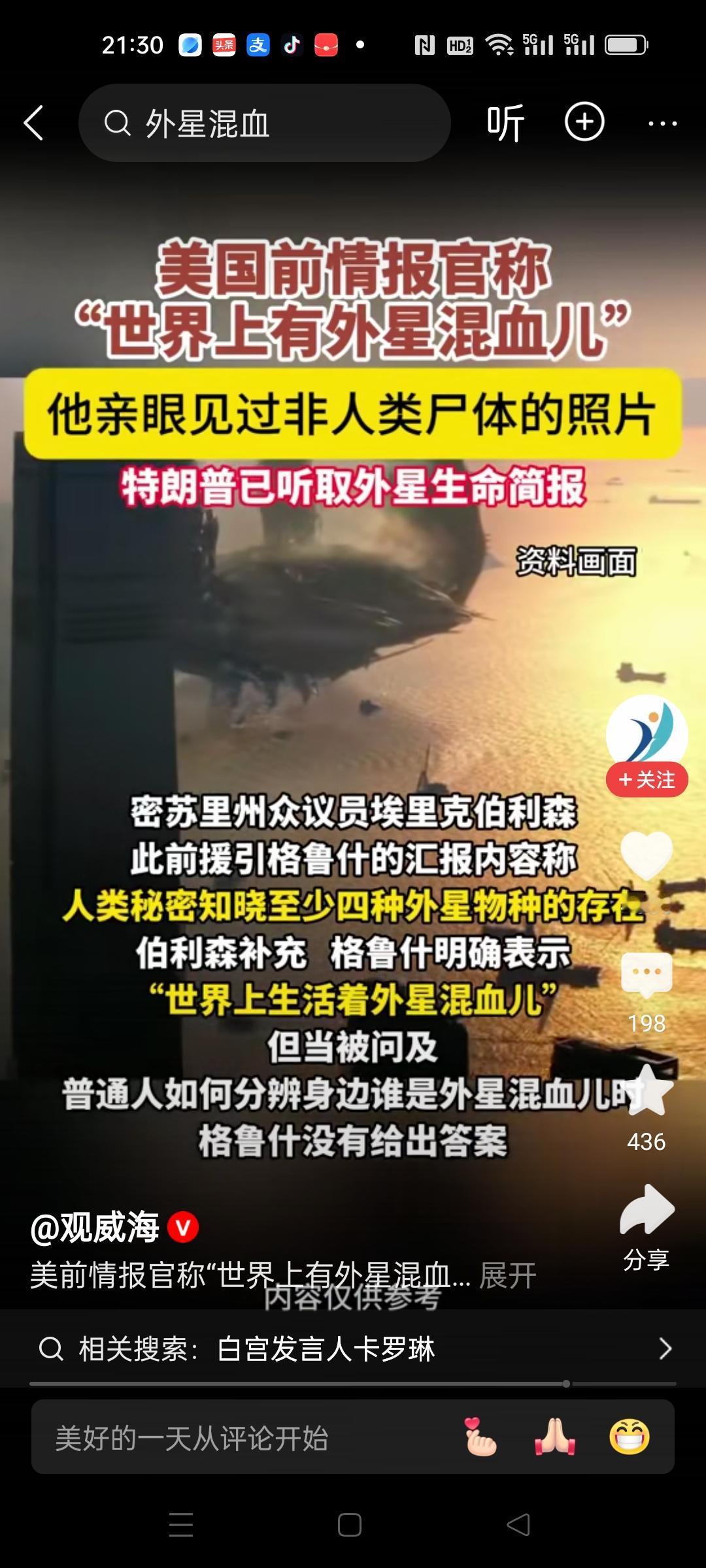 我就知道地球上存在外星生命,美国前空军少校大卫,格鲁什透露地球上存在外星混血儿。 他自己就见过非人类的遗骸,人类秘密知道的至少有四种外星生命的存在。特朗普都听过外星生命的简报。 还是把秘密公开吧,让全世界都知道,人类在宇宙中并不孤单,还有别的智慧生物和我们一起 外星人遇难