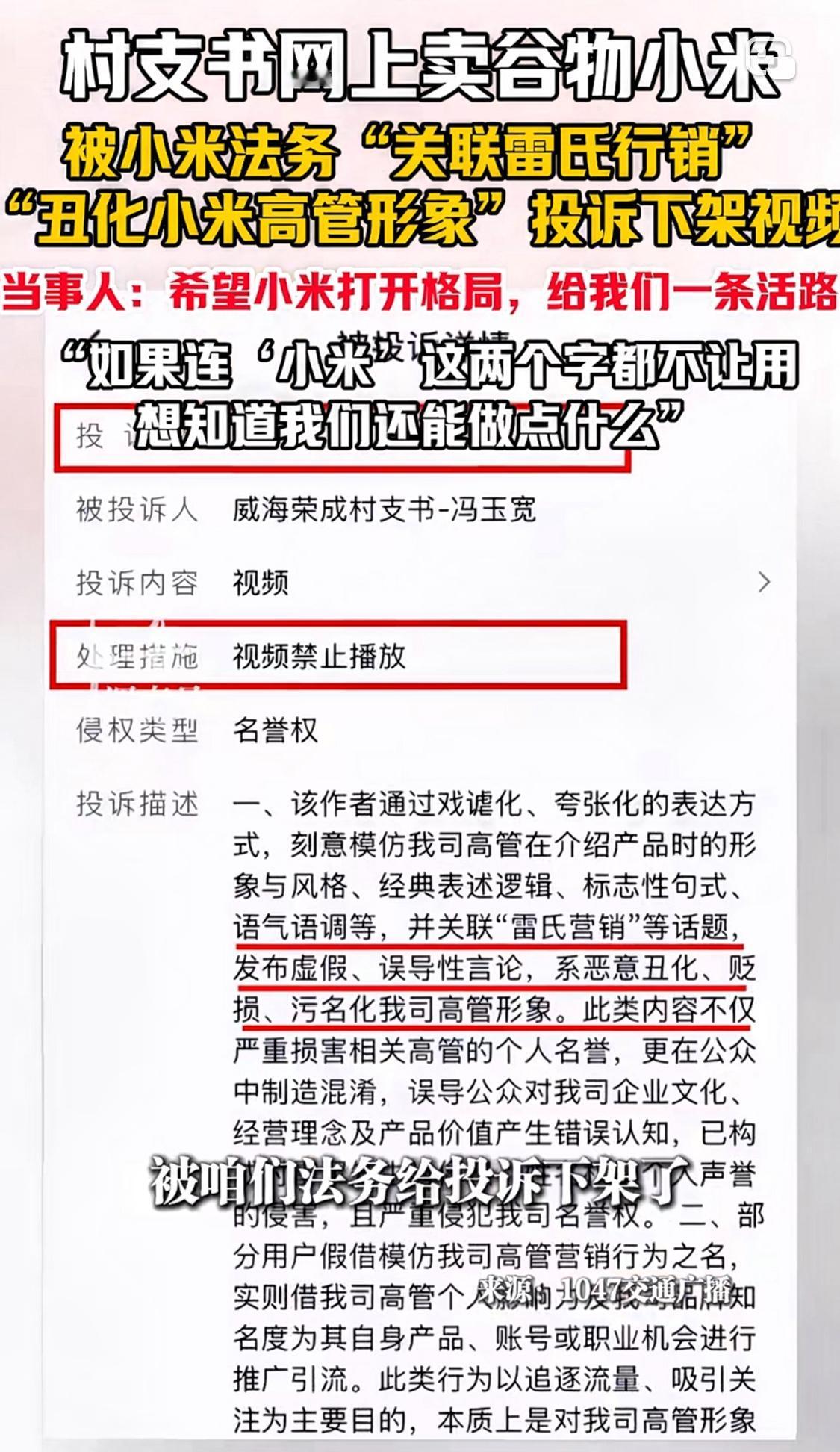 村支书卖小米却被小米法务举报,本来我还挺同情这个想帮助老百姓卖小米的书记,但看了他的“道歉”视频和被下架原因,瞬间觉得小米是对的…… 虽小米的格局确实可能不大,但明明小米法务将其视频举报下架的原因是“发布虚假、误导性言论,丑化、贬损了雷军的形象”,而不是如这位村支书所说的不让其在产品介绍时提“小米”。 故意蹭小米热度没毛病,毕竟小米一直是舆论焦点,模仿雷氏发言确实有助于“出圈”。但你不能一直去拿人家以往的“出糗”时刻恶搞,更不能偷换概念的道歉…… 那么多卖农产品小米的,也没见哪个被小米法务举报。不反思自身真正所犯问题,却要劝小米格局打开,也没谁了……
