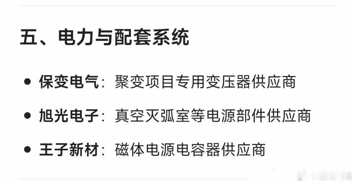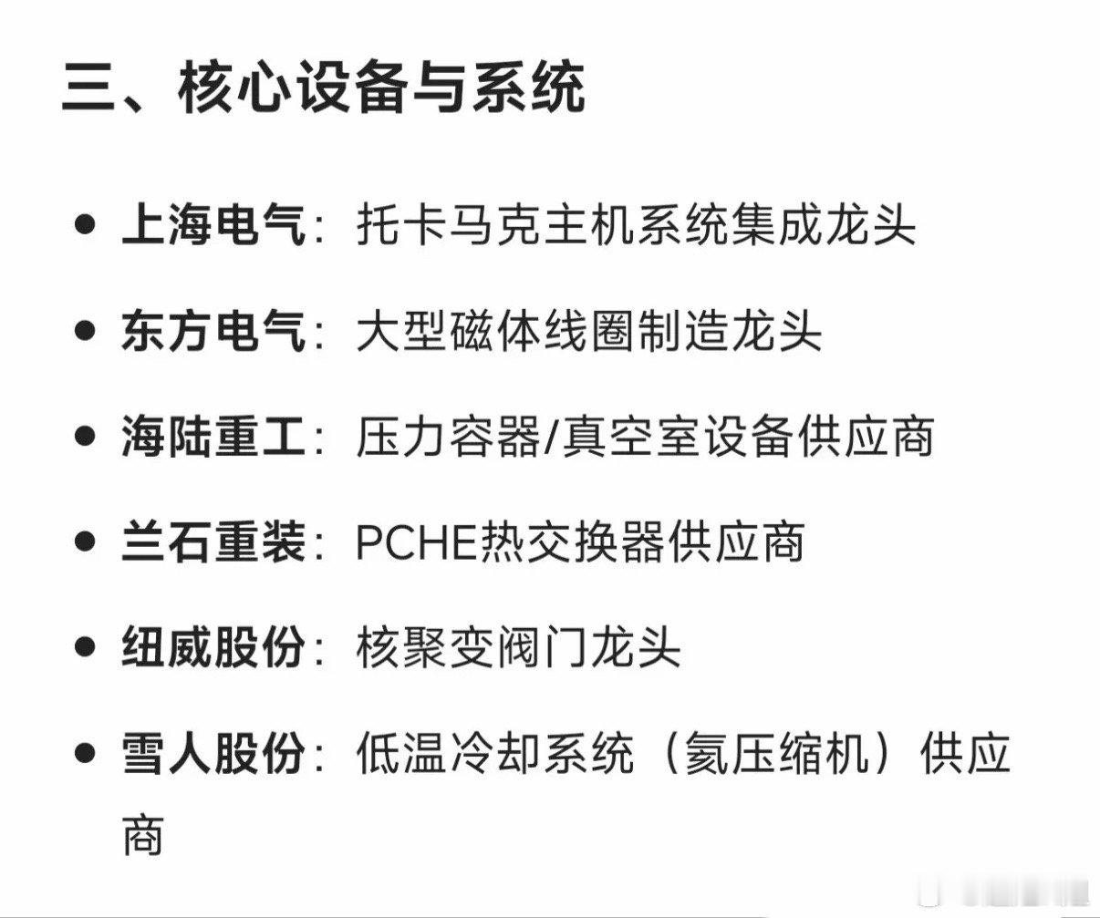 可控核聚变核心细分龙头1. 超导材料与磁体:西部超导(超导线材)、永鼎股份(高温超导带材)、联创光电(高温超导磁体)2. 关键结构件/特种材料:安泰科技(全钨偏滤器)、国光电气(偏滤器部件)、应流股份(反应堆结构件)、东方钽业(超导铌材)3. 核心设备与系统:上海电气(托卡马克集成)、东方电气(磁体线圈)、雪人股份(低温冷却)、纽威股份(核聚变阀门)4. 工程建设与总装:中国核建(ITER主机安装)、融发核电(CFETR模块)、中国能建(发电岛设计)5. 电力与配套:保变电气(专用变压器)、旭光电子(电源部件)、王子新材(磁体电源电容器)