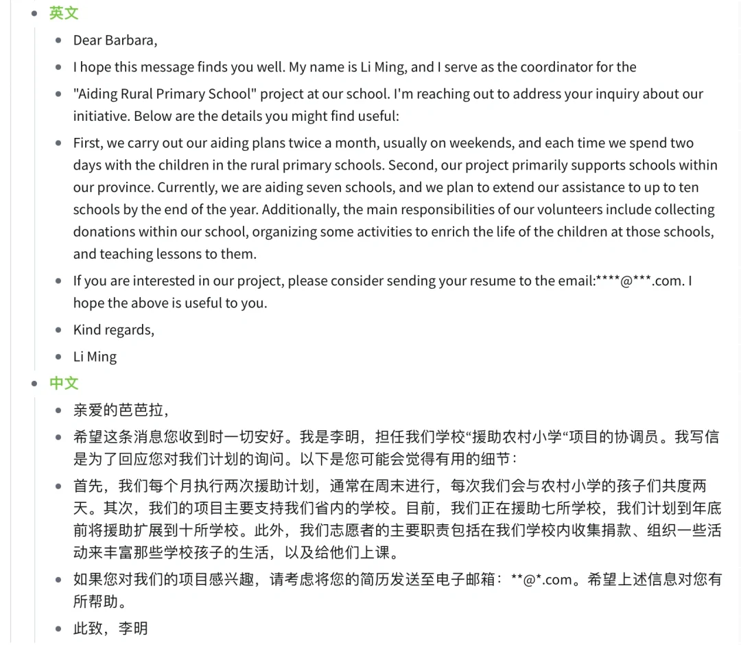 希望这条消息您收到时一切安好。我是李明,担任我们学校“援助农村小学“项目的协调员。我写信是为了回应您对我们计划的询问。以下是您可能会觉得有用的细节: