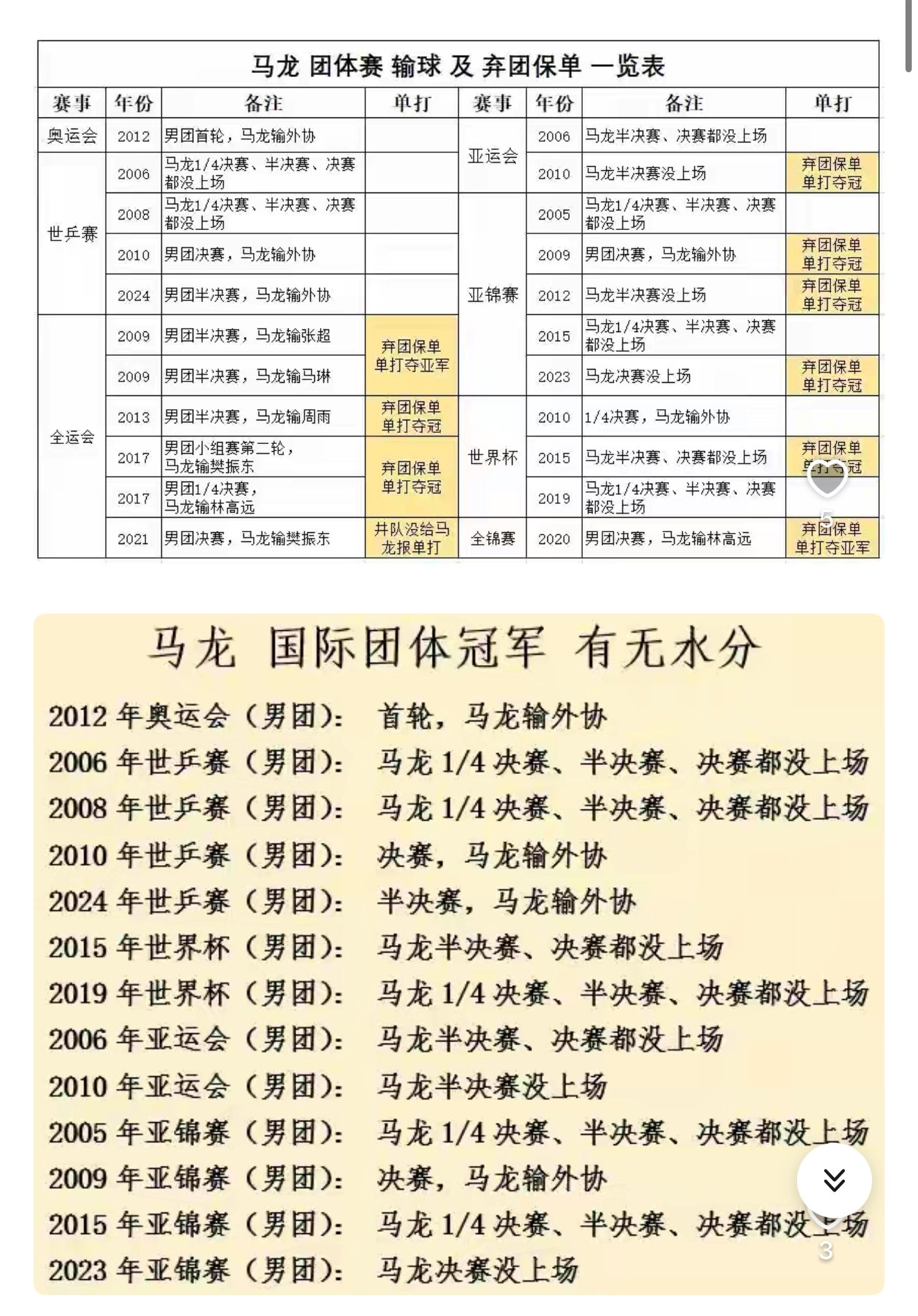 存档龙太子。1资源不断,“马龙八连败仍受宠,刘:更坚定用他的信心”。2“备战东京,马龙有了“智囊团”,所有大赛输过的对手全部在樊振东半区。3世乒赛马龙三单输球登封面,被赞定海神针,而“ 樊振东一单两分难建功”,照片只漏出半张脸。4马龙参加8次世乒赛,4次拿机动名额。参加9次世界杯7次输外协。作为主力三大赛参赛次数最多,输外协次数最多。5:买热搜,结果捐款金额没有樊振东的1/5。