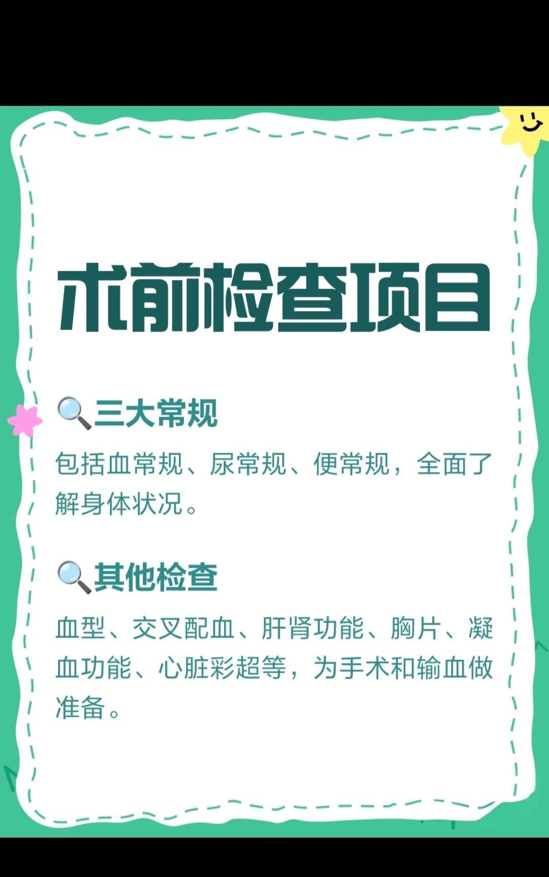 胸外科手术可是个大工程,涉及到心肺和大血管这些重要部位。所以,术前得做一系列常规检查,比如三大常规(血常规、尿常规、便常规)、血型、交叉配血、肝肾功能、胸片、凝血功能、心脏彩超等。这些检查能帮医生全面了解你的身体状况,为手术和输血做好准备。