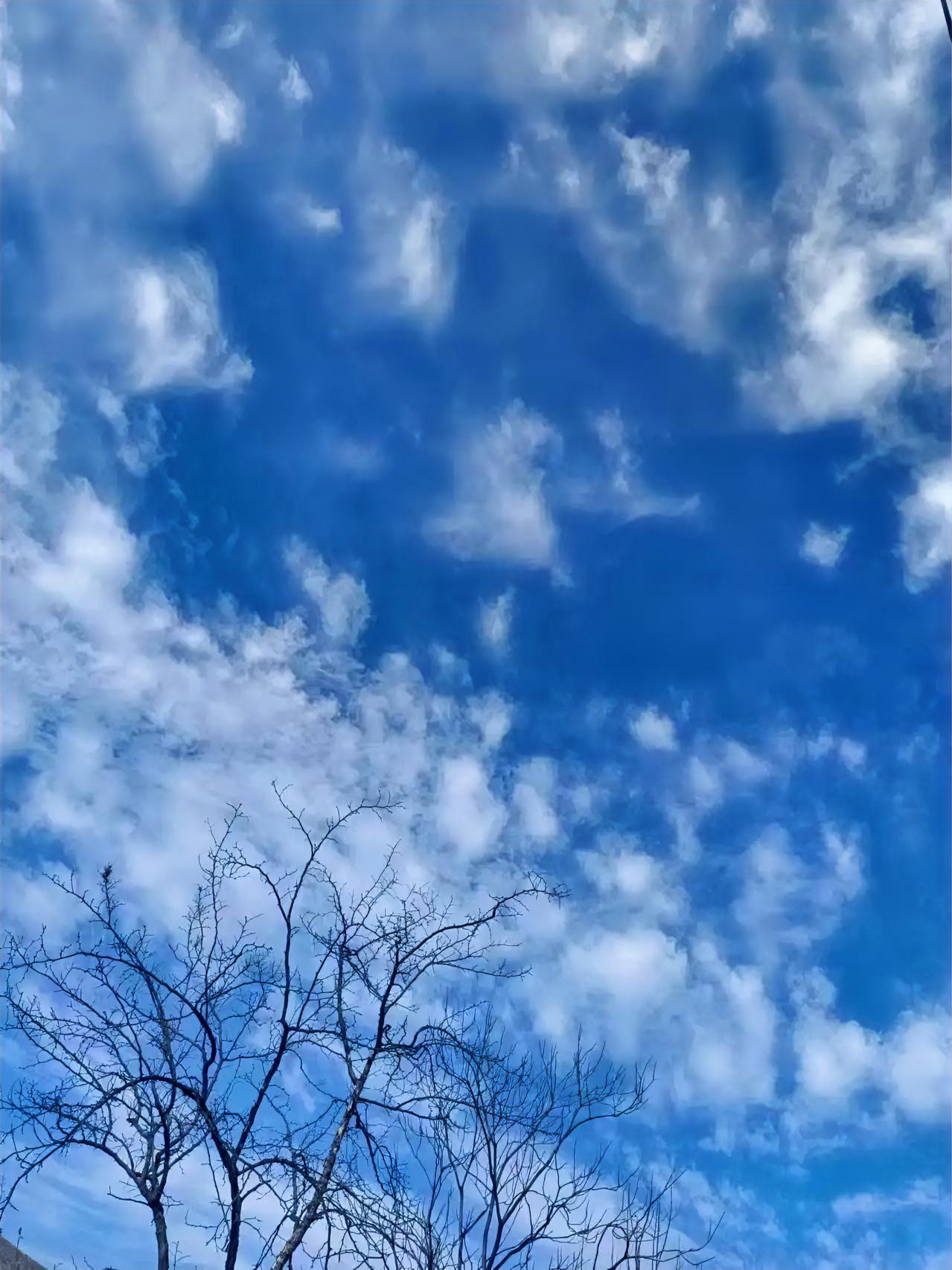 晴空与枝 抬眼撞见这片晴空,蓝得澄澈,像被洗过千百遍。云是细碎的絮,轻飘飘地浮着,漫不经心地铺满天幕。 枯枝的轮廓利落地支棱在蓝天下,没有叶的遮掩,每一道枝丫都清晰可见,像用墨线勾勒的简笔画。看似萧瑟,却与鲜活的蓝天相映,生出一种疏朗的美。 风穿过枝桠,没有簌簌的叶响,只听见空气流动的轻响。站在这样的天地间,心里的褶皱仿佛都被这清风与蓝天抚平,简单,又安宁。 治愈系风景白云 晴朗白云 治愈系白云 要