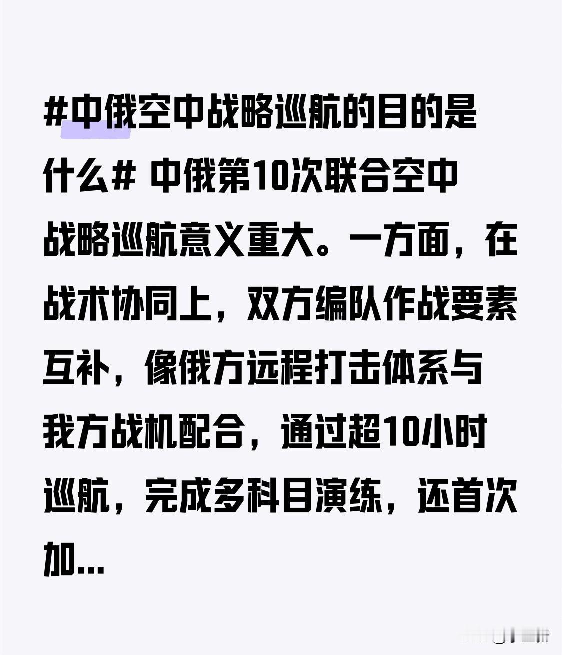 中俄第10次联合空中战略巡航意义重大。一方面,在战术协同上,双方编队作战要素互补,像俄方远程打击体系与我方战机配合,通过超10小时巡航,完成多科目演练,还首次加入联合应急处置科目,提升实战化水平。 另一方面,从地缘政治看,行动与辽宁舰编队协同,从三个方向对琉球群岛形成合围态势,虽不针对第三方,却也彰显维护地区安全稳定的决心,深化了中俄战略互信,筑牢地区安全屏障。