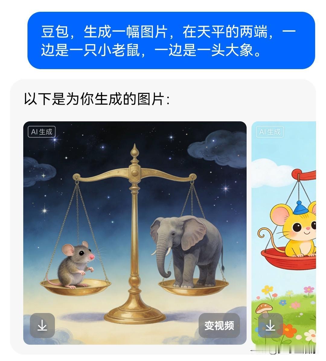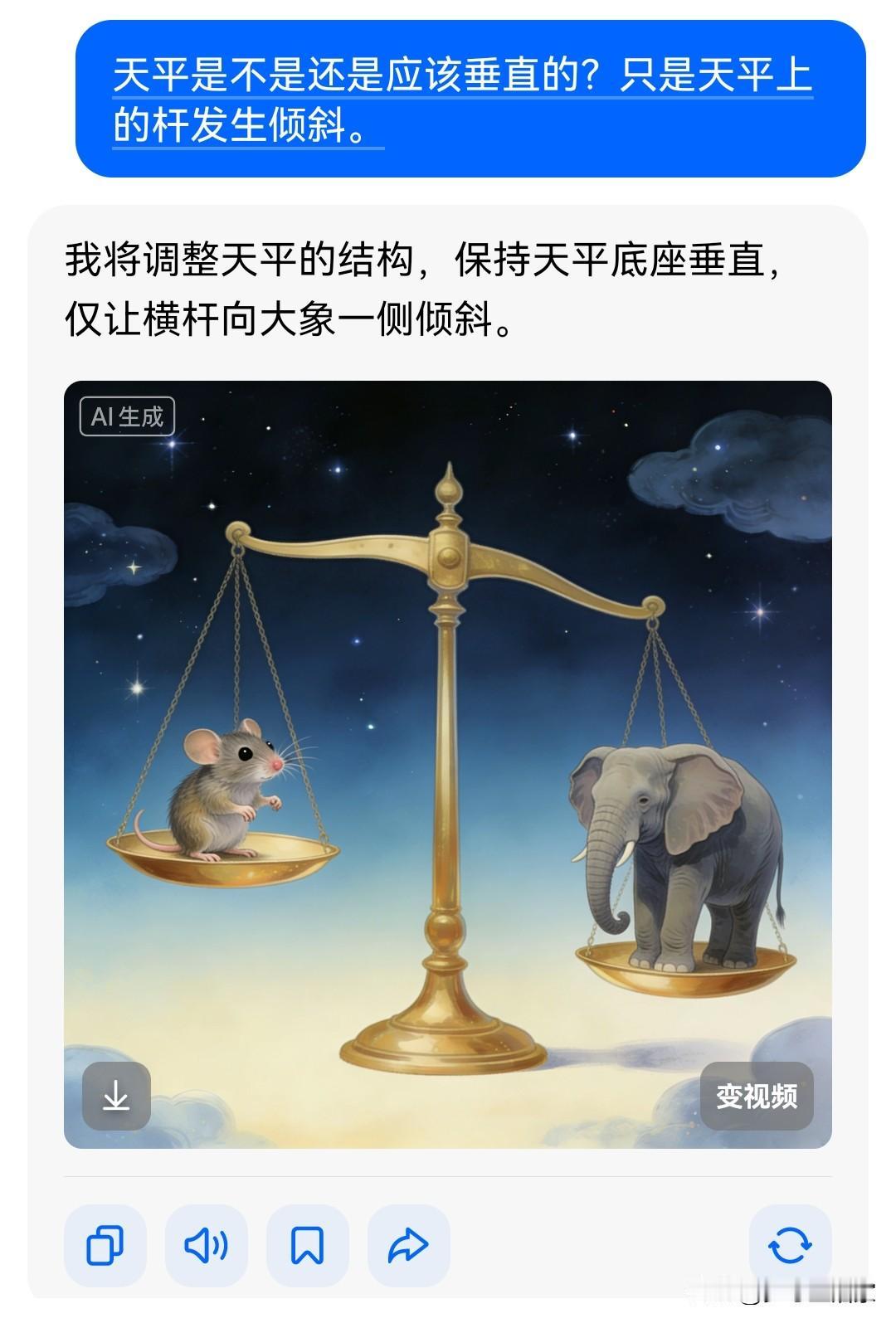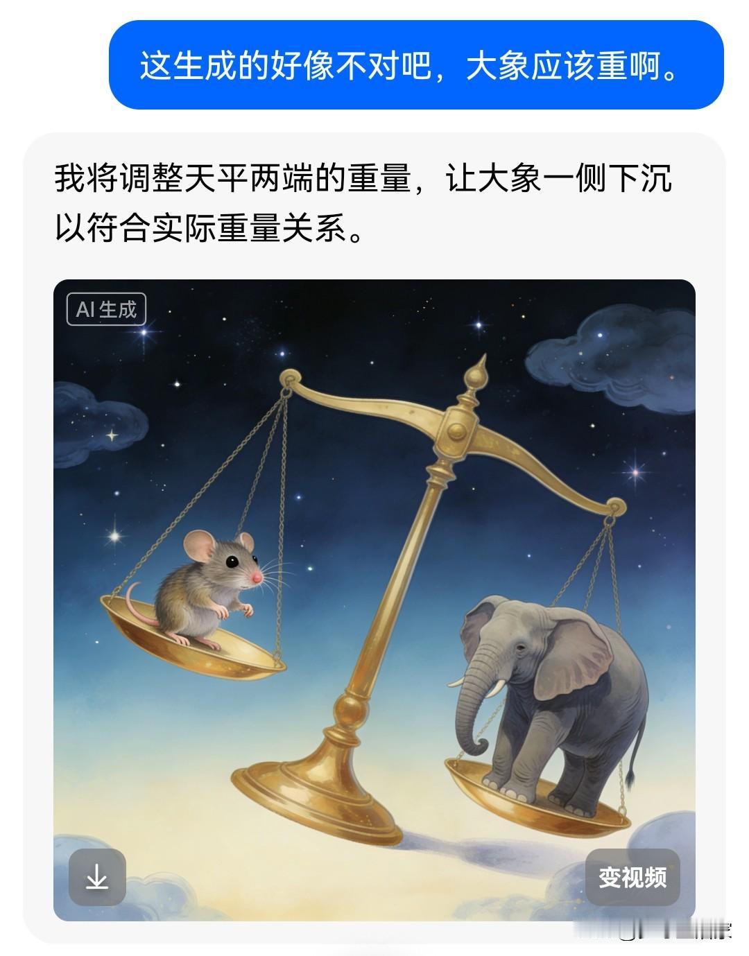 AI时代到来了,我们是不是该拥抱它。 任何技术的发展大趋势可能都是好的,但我们要利用好它,人类是使用者而不应该是被误导者。 就像下面的三张图片对话,天平的两侧一端是老鼠一端是大象,只让AI生成就是第一幅图两端一样平。 但是人有判断力,通过和实际情况进行类比,和不断调整要求,就成了第三幅图,基本符合常识。 所以从使用尖利的石头、钻木取火、到现在的AI工具,人类都是要因地制宜,真正的让工具为我所用。 当然也要有分辨力,批判思维。合理使用,服务大众,不是伤害他人,误导他人。