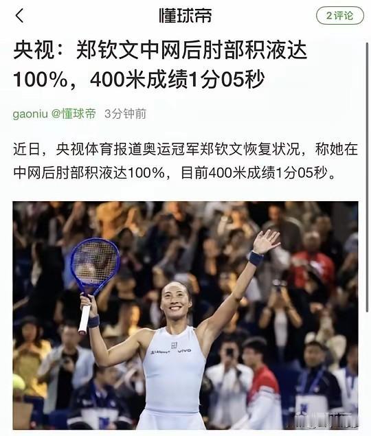 得知郑钦文中网后肘部积液达100%,心里瞬间揪了一下——从7月就因伤治疗,到中网赛事后伤情反复,小郑这一路的伤病困扰,实在让球迷心疼。 但看到她400米跑出1分05秒的成绩,又忍不住感到欣慰。网球运动员的身体是赛场的武器,肘部的伤病本就会限制训练和运动,可她没有躺平,反而用跑步这样的方式坚持体能训练,这份不向伤病低头的韧劲,正是我们喜欢她的原因。 作为中国网球的新星,郑钦文在奥运赛场上的突破让无数人看到了希望,而赛场下她与伤病对抗的模样,更让我们看到了职业运动员的坚守。不必急于求成,只愿她能慢慢康复,把身体调整到最佳状态,毕竟健康的郑钦文,才是网坛最耀眼的那束光。 郑钦文 郑钦文赛程安排 郑钦文退赛 郑钦文武网四强 郑钦文麒麟臂 郑钦文体脂率 郑钦文武网见
