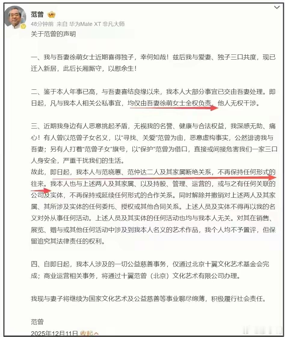 范曾宣布与女儿继子断绝关系很多人都担心范老被骗,但看到他笑得那么开心也就放心了,人嘛,只要开心就够了,什么财产、名望都是过眼云烟,生不带来死不带去,只要活着是胜利,快乐才是真谛,把每一天过明白,他就是最幸福的人!热点观点